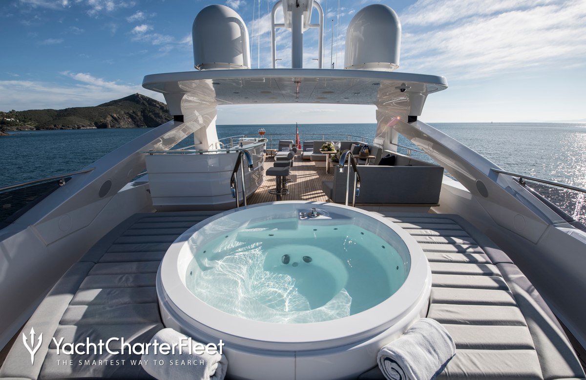 A charter on Sweet Escape is comfortable and convenient thanks to the provided amenities such as a gym with all the latest equipment to maintain your fitness routine. Retreat to the deck jacuzzi and soak up the scenery.