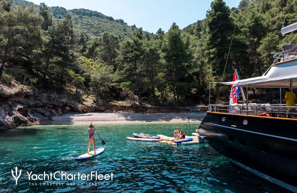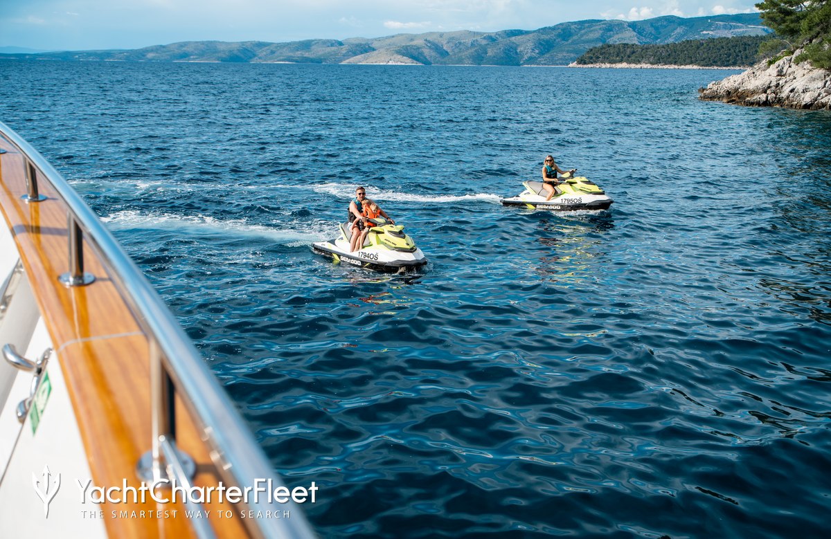 Onboard Dalmatino has a range of toys and accessories to keep you and your guests entertained on the water throughout your stay. Take to the sea on the Jet Skis offering you power and control on the water. Also there are waterskis that are hugely entertaining whether you are a beginner or a seasoned pro. Additionally, there are SEABOBs, that allow you to skim along the surface or steer under the crystal water and experience life swimming with the fish. If that isn't enough Dalmatino also features wakeboards, canoes, fishing equipment, paddleboards and snorkelling equipment. Dalmatino also sports a 6m/19'8" Tender to transport you with ease.