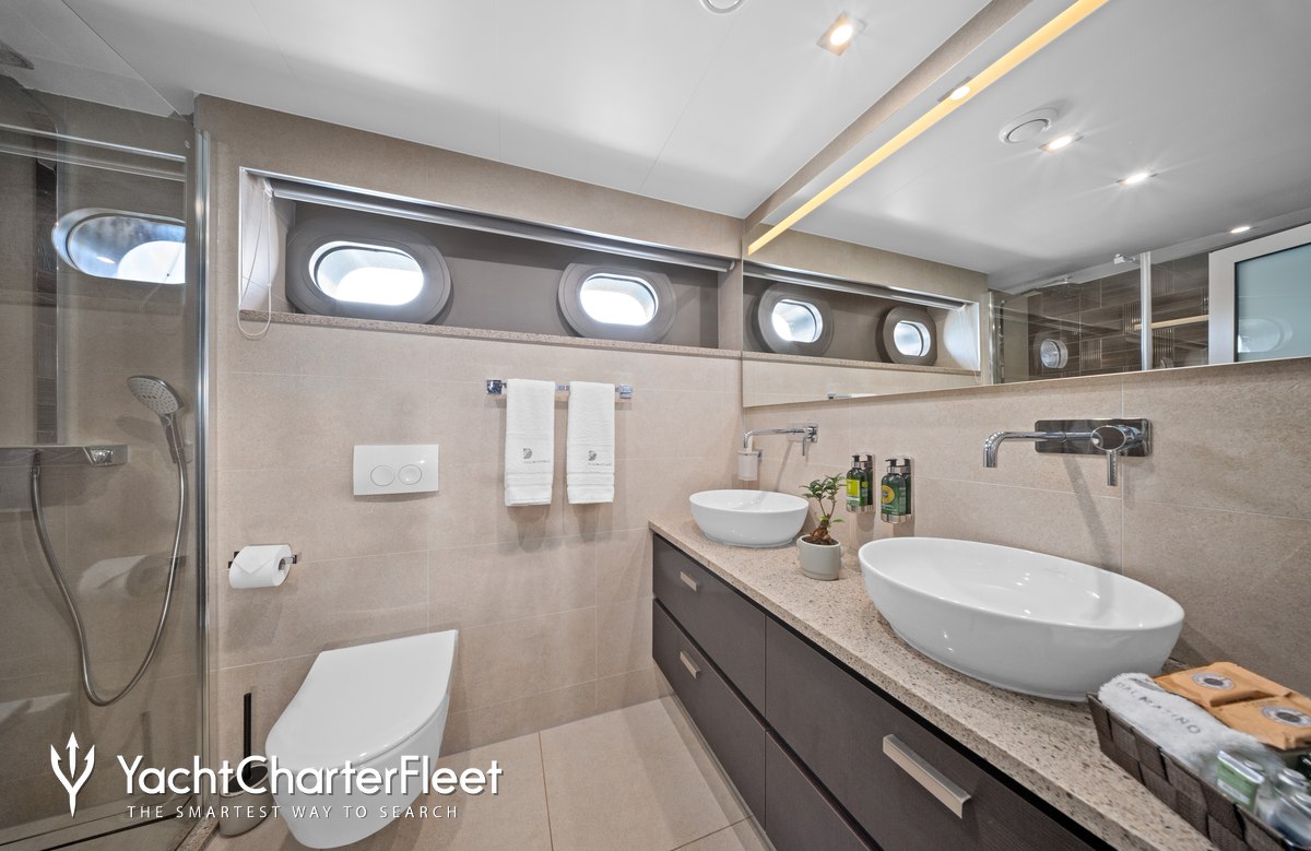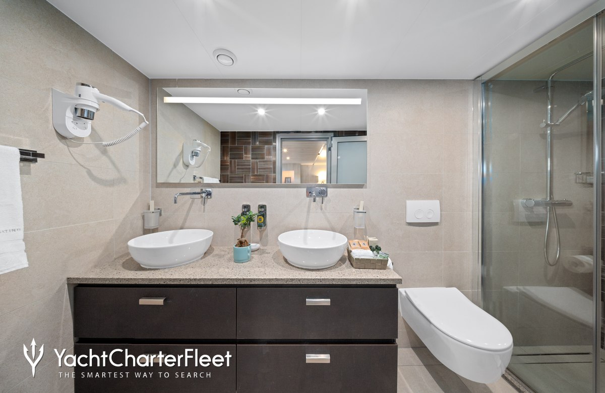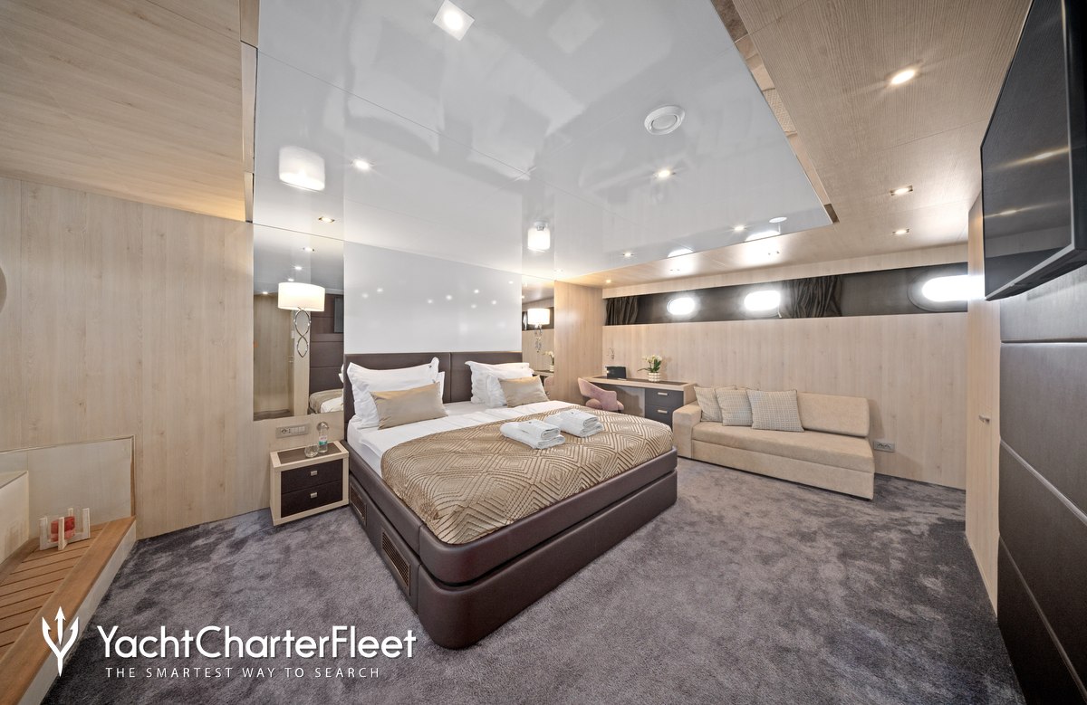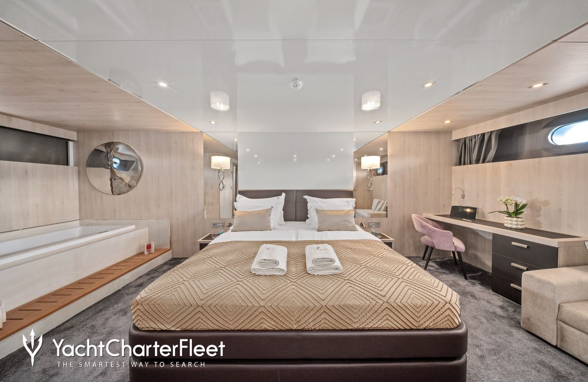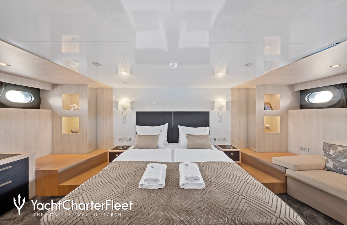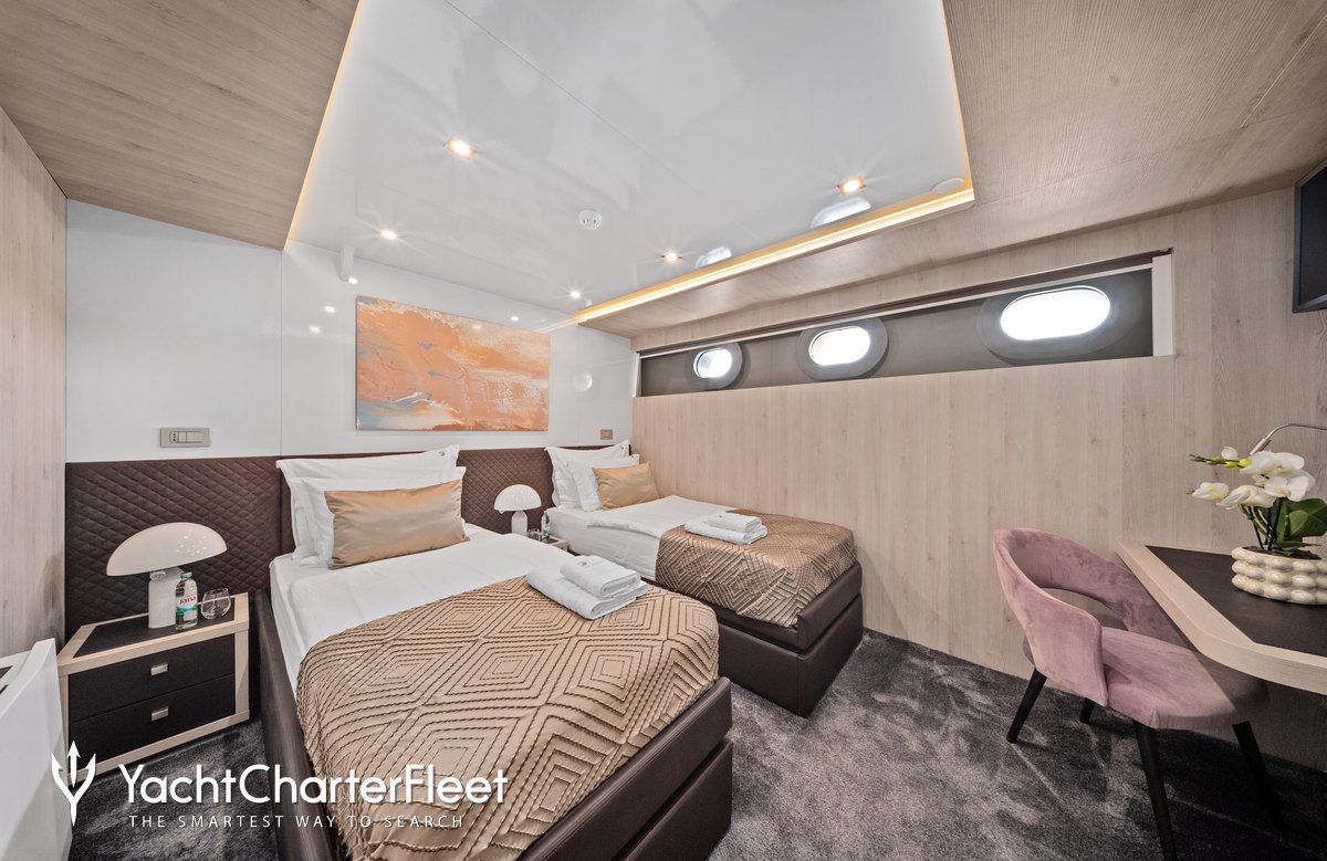 Built in 2019, Dalmatino offers guest accommodation for up to 12 guests in 6 suites comprising a master suite, one VIP cabin, two double cabins and two twin cabins. There are 8 beds in total, including 2 queen, 2 doubles and 4 singles. She is also capable of carrying up to 8 crew onboard to ensure a relaxed luxury yacht charter experience.