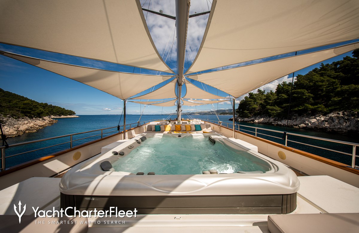Keeping comfortable and entertained on Dalmatino is easy thanks to the available amenities including a deck jacuzzi, perfect to enjoy the scenery with your favourite drink in hand.