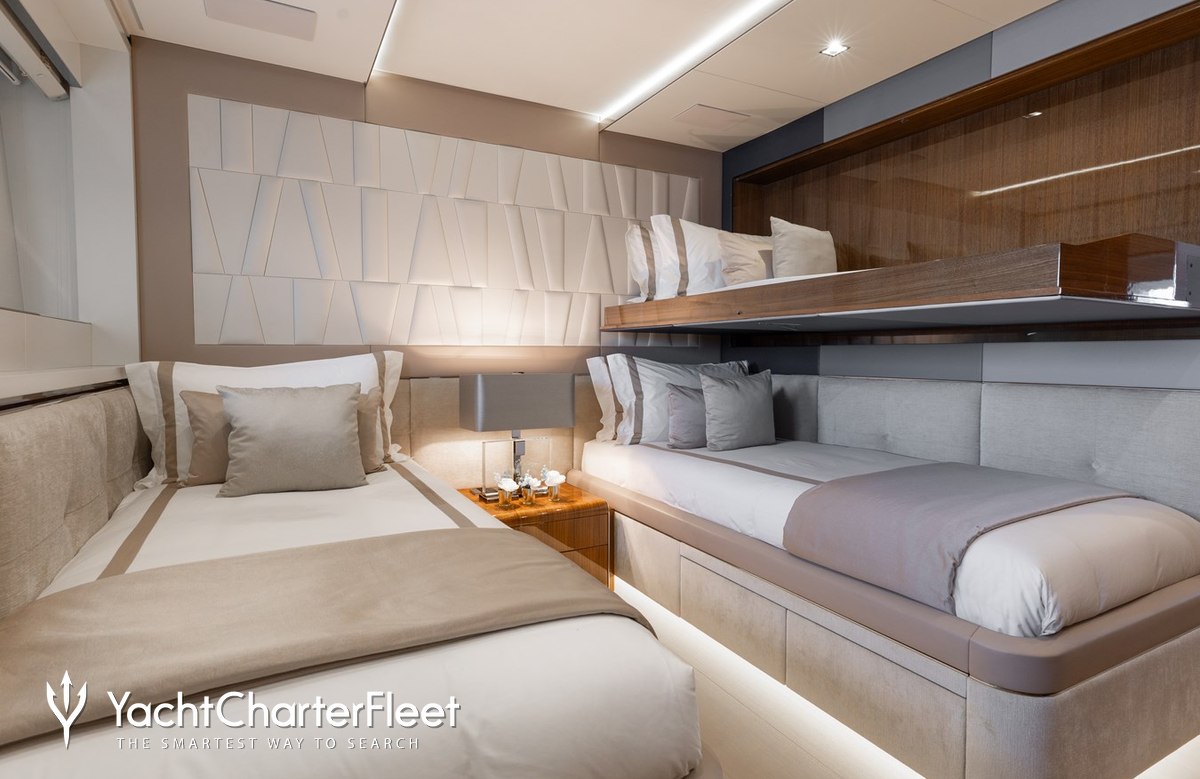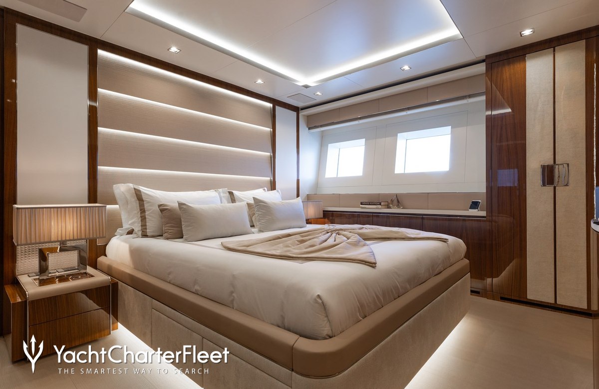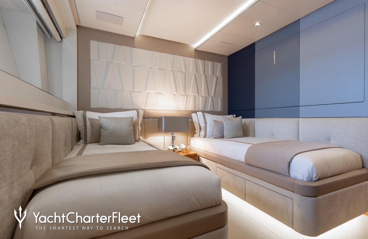 Built in 2020, Velocity offers guest accommodation for up to 12 guests in 7 suites comprising a master suite located on the main deck, two VIP cabins and four twin cabins. The supremely spacious full beam master suite features extensive storage space provided by the dressing room benefits from a his and her bathroom. She is also capable of carrying up to 9 crew onboard to ensure a relaxed luxury yacht charter experience.
