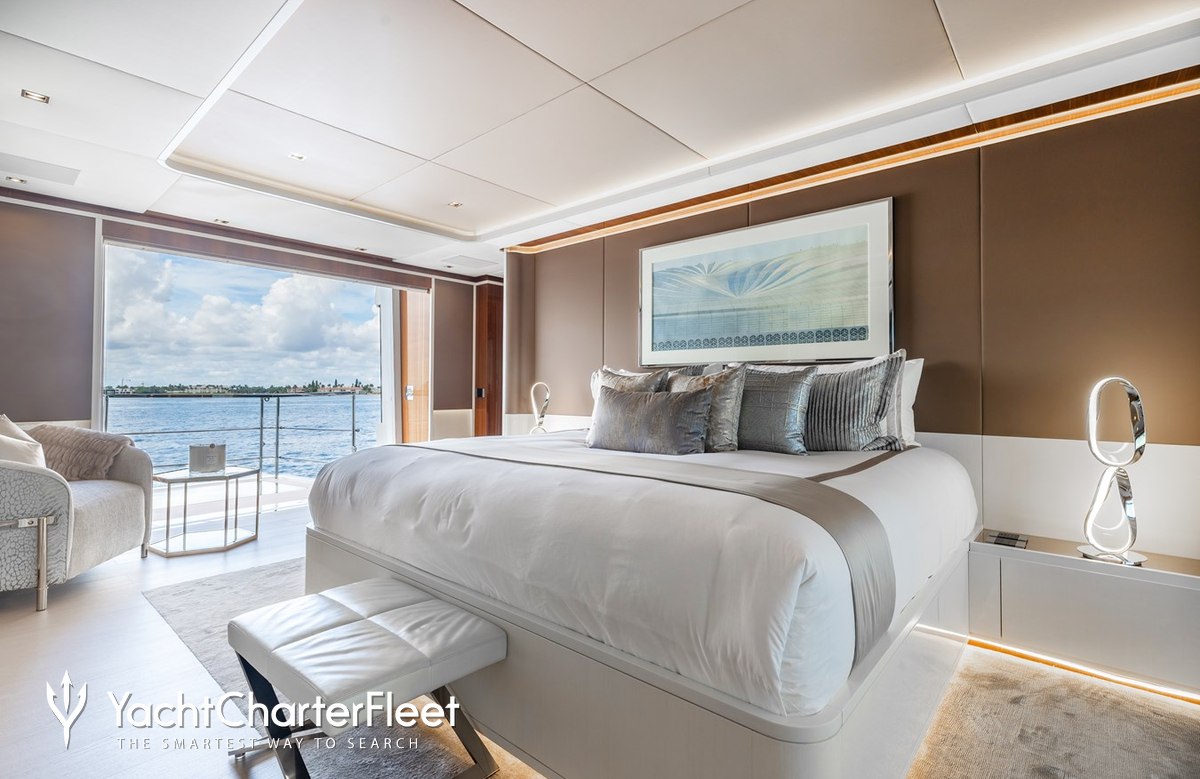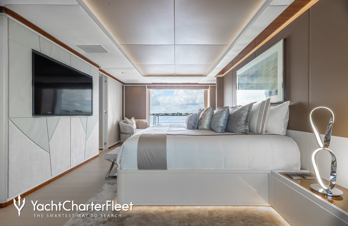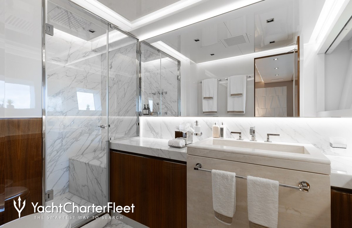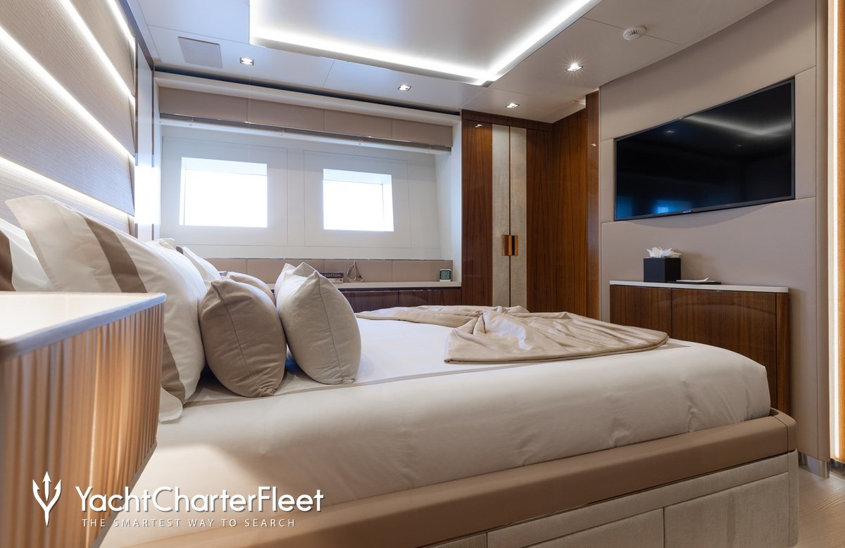 Built in 2020, Velocity offers guest accommodation for up to 12 guests in 7 suites comprising a master suite located on the main deck, two VIP cabins and four twin cabins. The supremely spacious full beam master suite features extensive storage space provided by the dressing room benefits from a his and her bathroom. She is also capable of carrying up to 9 crew onboard to ensure a relaxed luxury yacht charter experience.