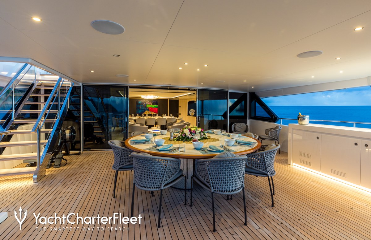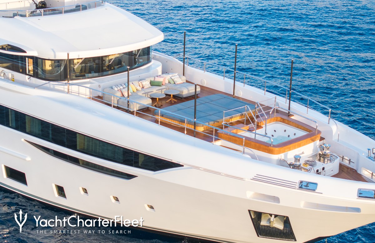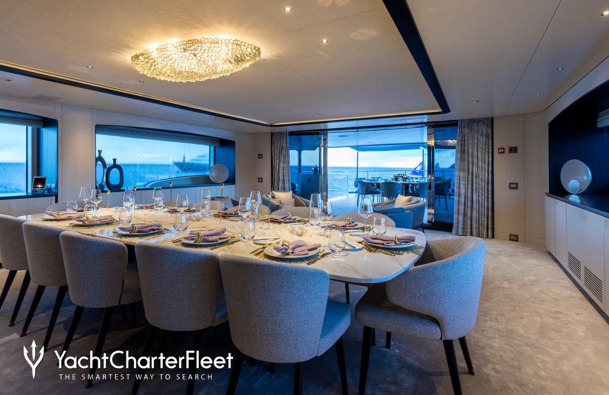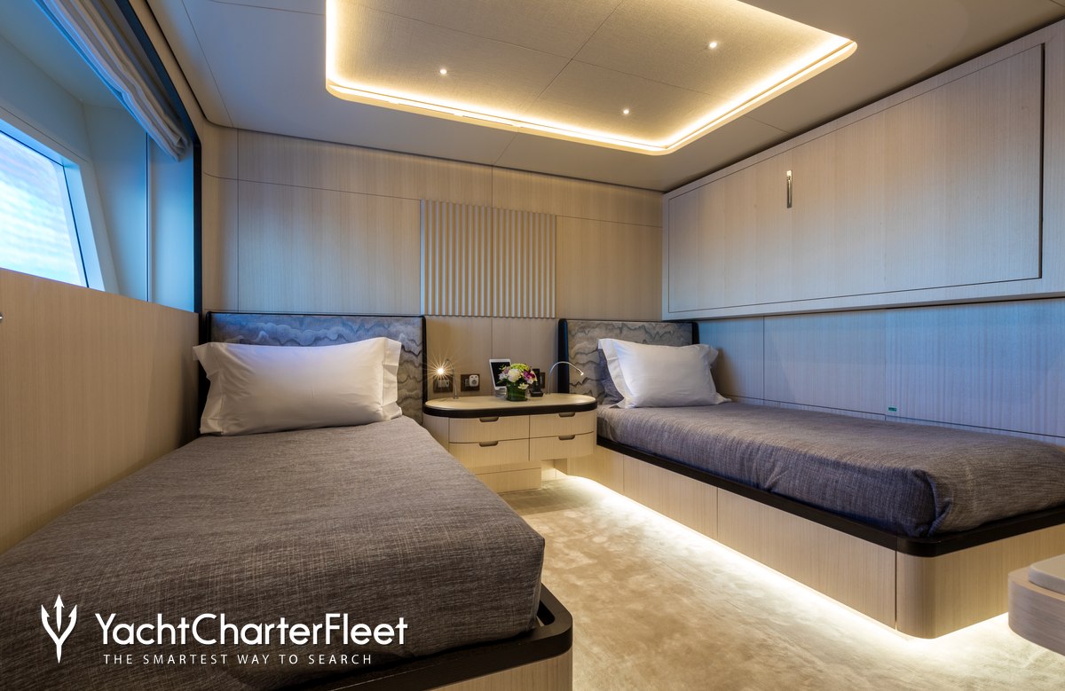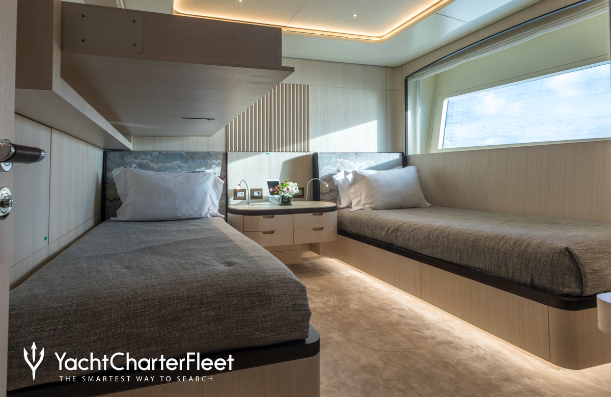 Families will particularly love Casa thanks to her child-friendly setup. Built in 2022, She offers guest accommodation for up to 12 guests with a layout comprising a master suite, two double cabins and two twin cabins. The supremely spacious full beam master suite incorporates its own study and dressing room. There are 9 beds in total, including 1 king, 2 queen, 4 singles and 2 pullmans. She is also capable of carrying up to 8 crew onboard to ensure a relaxed luxury yacht charter experience.