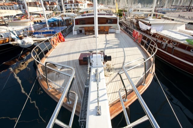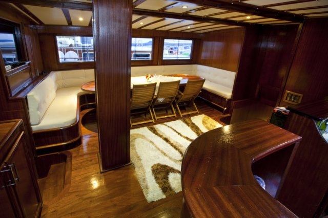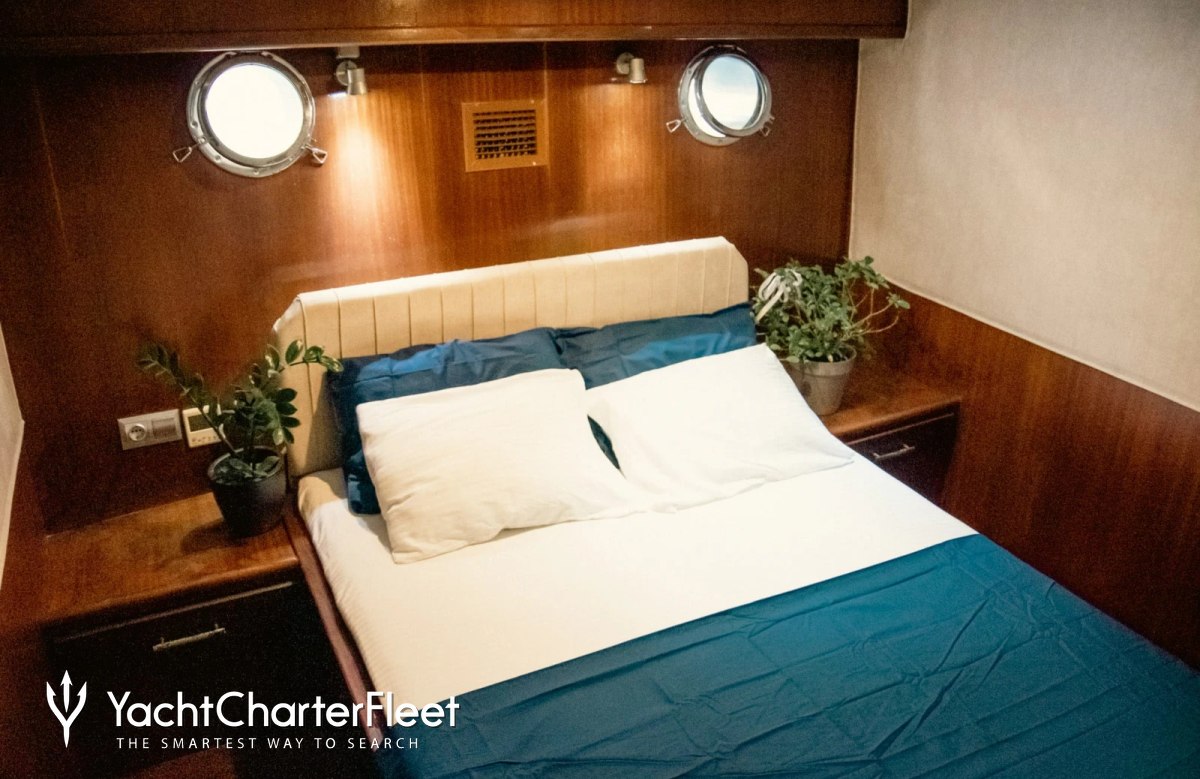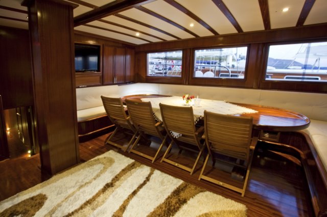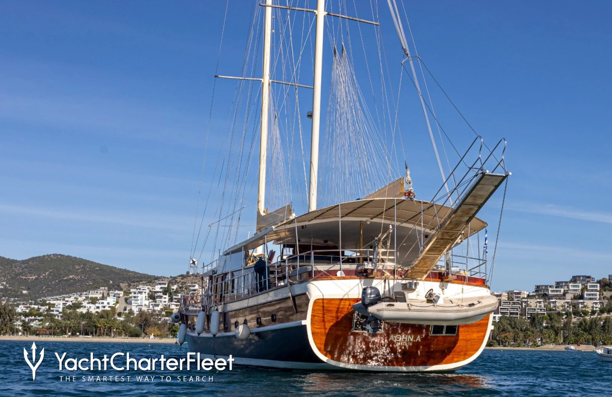 Athen.A is built with a wood hull and wood superstructure. Athen.A comfortably cruises at 8 knots, reaches a maximum speed of 12 knots. With a shallow draft of Athen.A can anchor closer to coves and sheltered bays overnight.