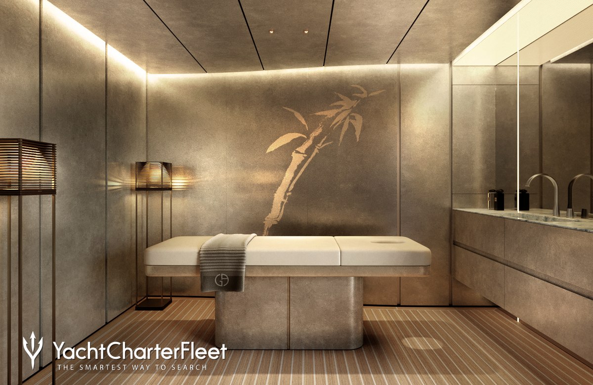 Her features include a spa, beauty salon, underwater lights, beach club, WiFi and air conditioning.