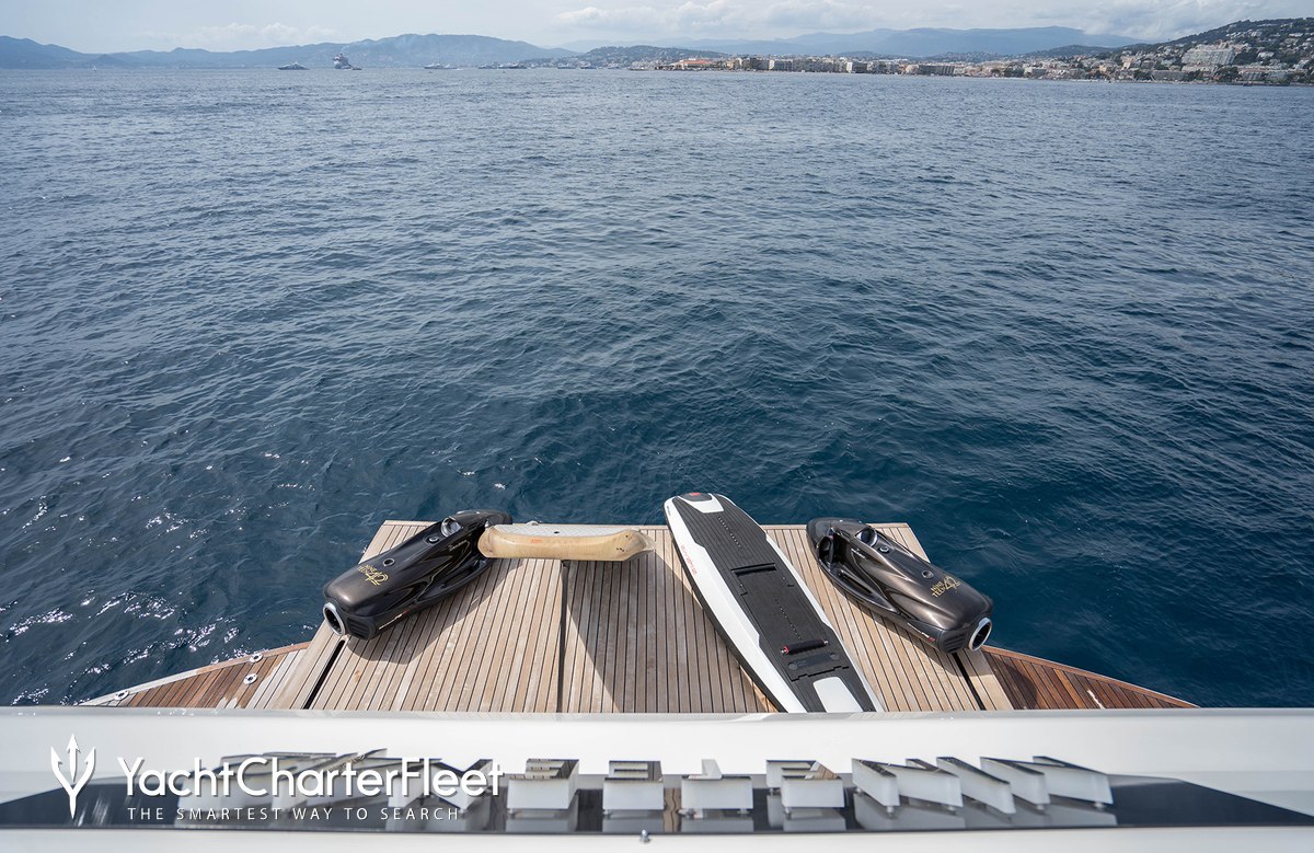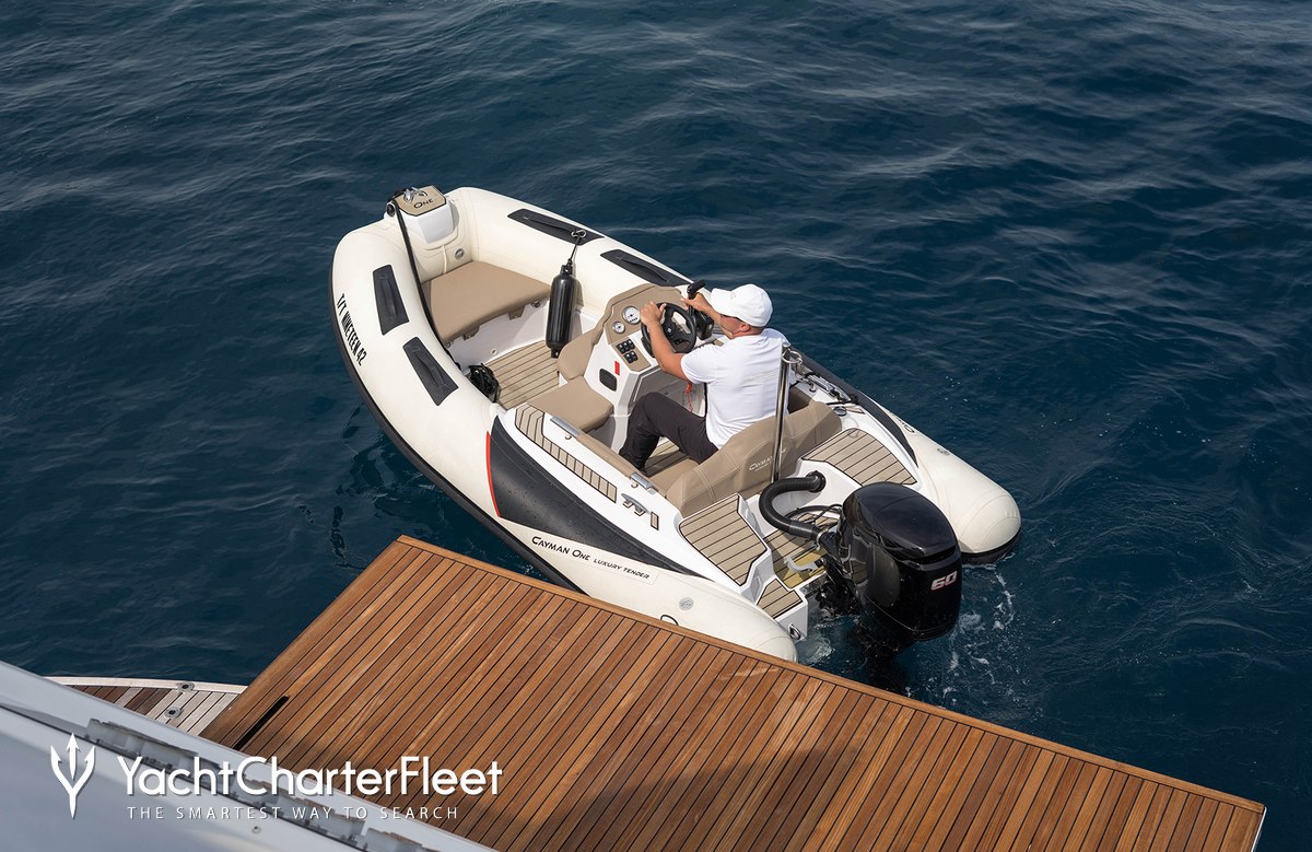 When not cruising Nineteen 42 has onboard an incredible selection of water toys and accessories for you and your guests to connect with the waters around you. Principle among these are waterskis that are hugely entertaining whether you are a beginner or a seasoned pro. Another excellent feature are two F5 SEABOBs, that allow you to skim along the surface or steer under the crystal water and see a variety of aquatic sea life. Additionally, there are wakeboards so guests can show off at speed. If that isn't enough Nineteen 42 also features paddleboards and snorkelling equipment. When it's time to travel from land to see, it couldn't be easier with a 3.65m/12' Ranieri Tender.