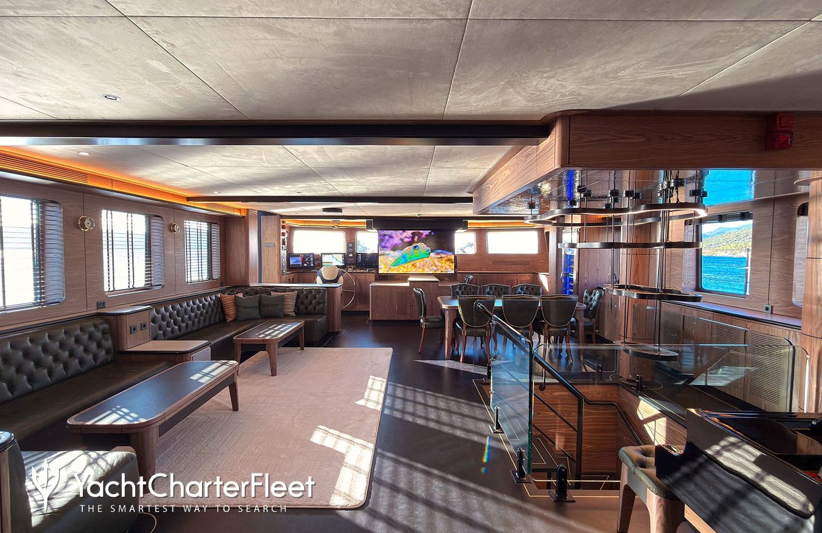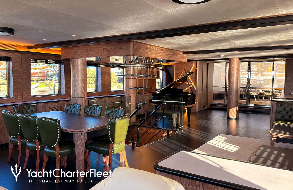 A charter on Oguz Khan is comfortable and convenient thanks to the provided amenities including a piano, perfect for creating a relaxed atmosphere for you and your guests. Sit back with a glass of champagne in the deck jacuzzi.