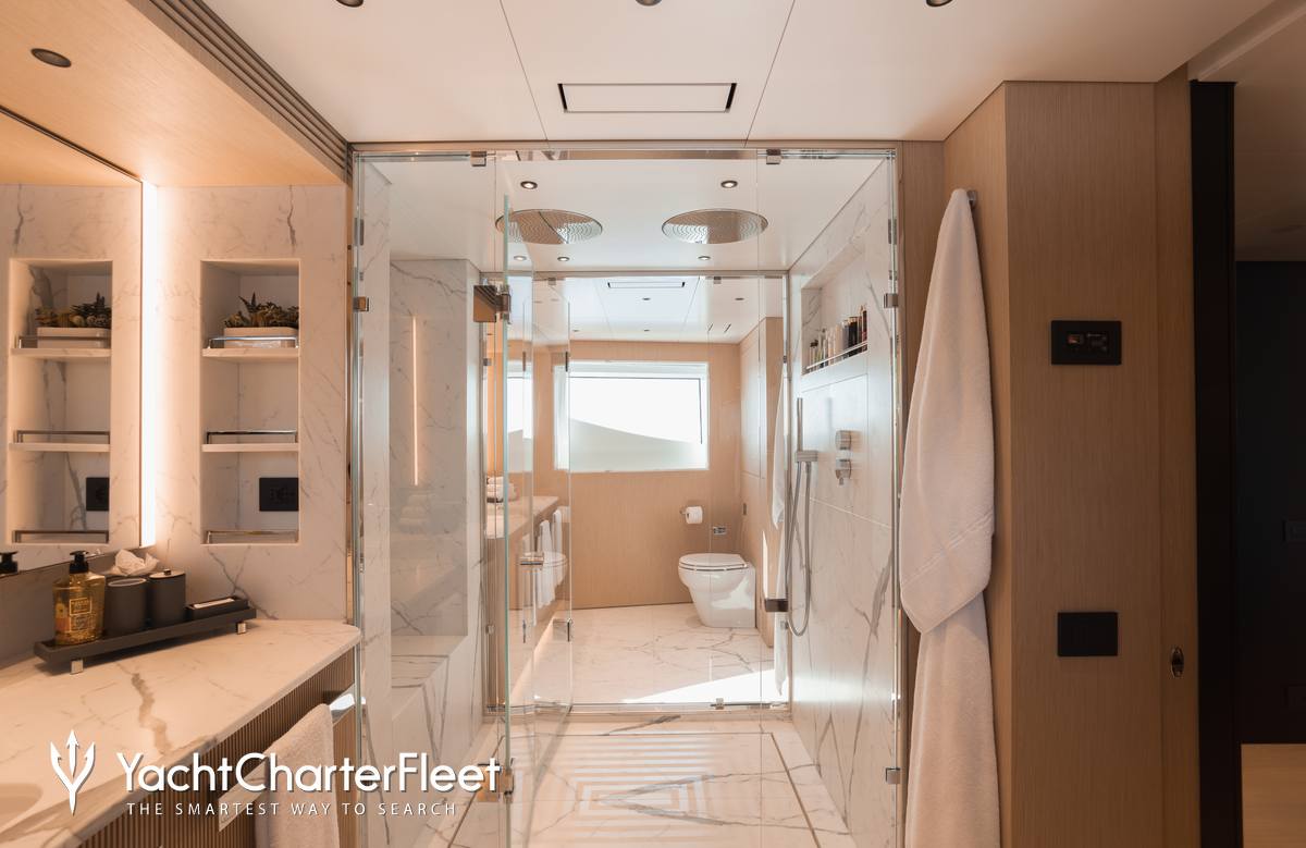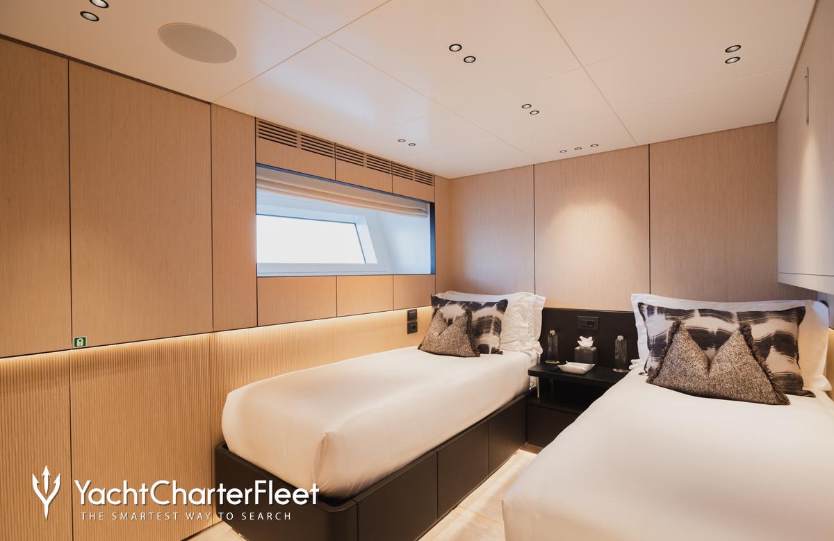 Lower Deck: two generous VIP cabins and two convertible twin cabins (can be configured as doubles)