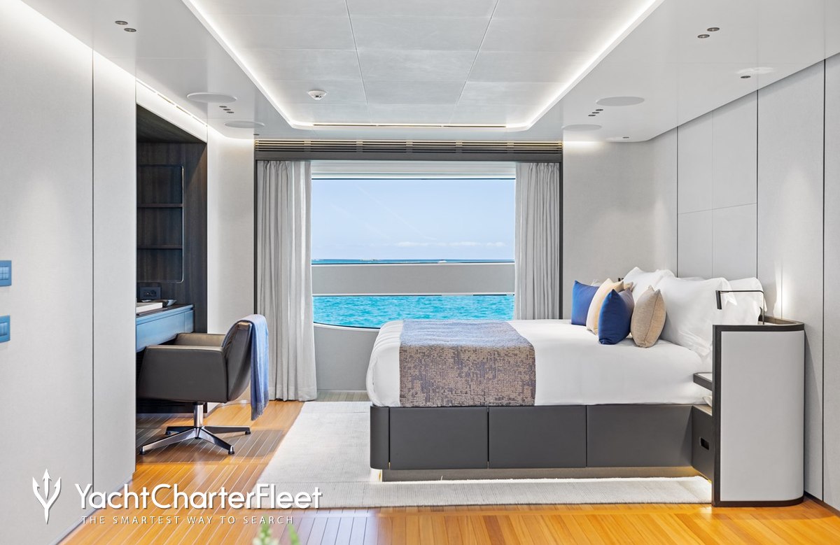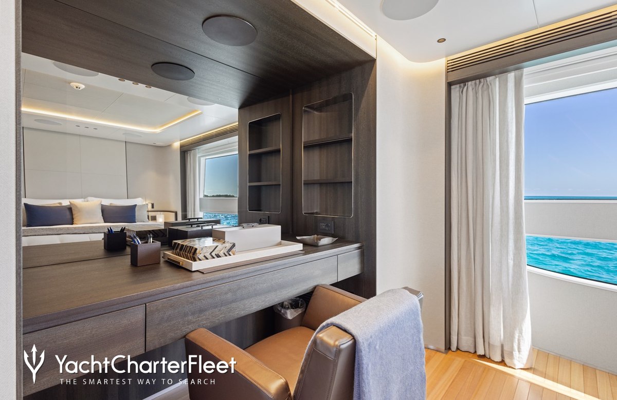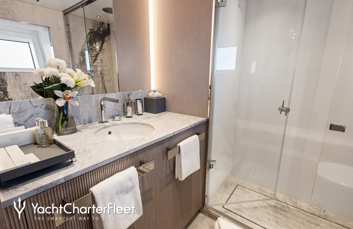 Wave offers guest accommodation for up to 10 guests in 5 suites comprising a master suite located on the main deck, two VIP cabins and two cabins that can operate as twins or doubles. The supremely spacious full beam master suite features extensive storage space provided by the dressing room benefits from a his and her bathroom. She is also capable of carrying up to 8 crew onboard to ensure a relaxed luxury yacht charter experience.