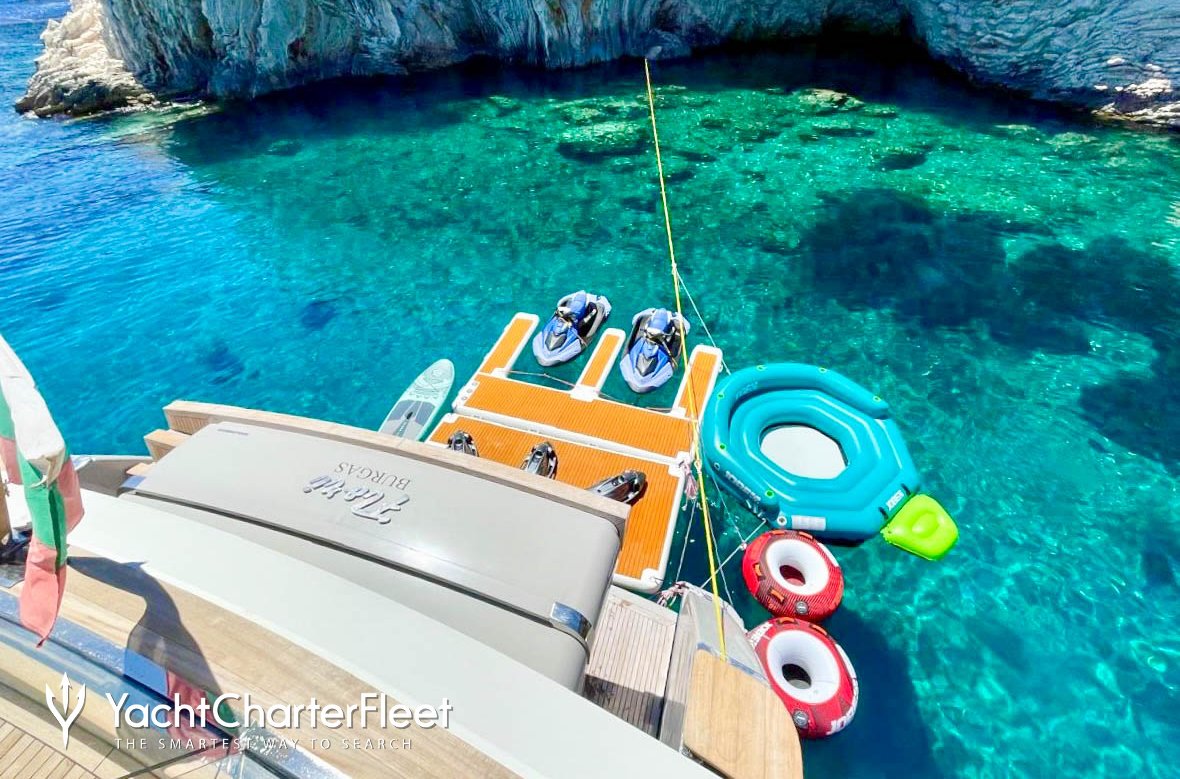 Flori knows a thing or two about fun on the water, with a selection of water toys and accessories for you and your guests to enjoy whilst on charter. Take to the sea on the Jet Skis offering you power and control on the water. In addition there are towable toys offering fun and adventure. Another excellent feature are three SEABOBs, offering a truly remarkable experience that lets you skim along the surface or swim with the fishes quietly and safely. Flori also sports a Williams Jet Tenders to transport you with ease.