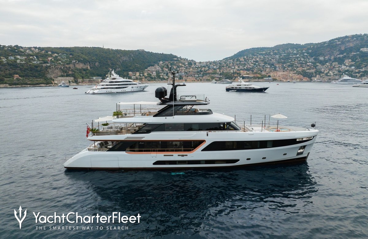 Built with a fiberglass hull and fibreglass superstructure, she offers greater on-board space and is more stable when at anchor thanks to her full-displacement hull. Powered by twin MAN engines, she comfortably cruises at 14 knots, reaches a maximum speed of 18 knots with a range of up to 3,800 nautical miles from her 35,000 litre fuel tanks at 10 knots.