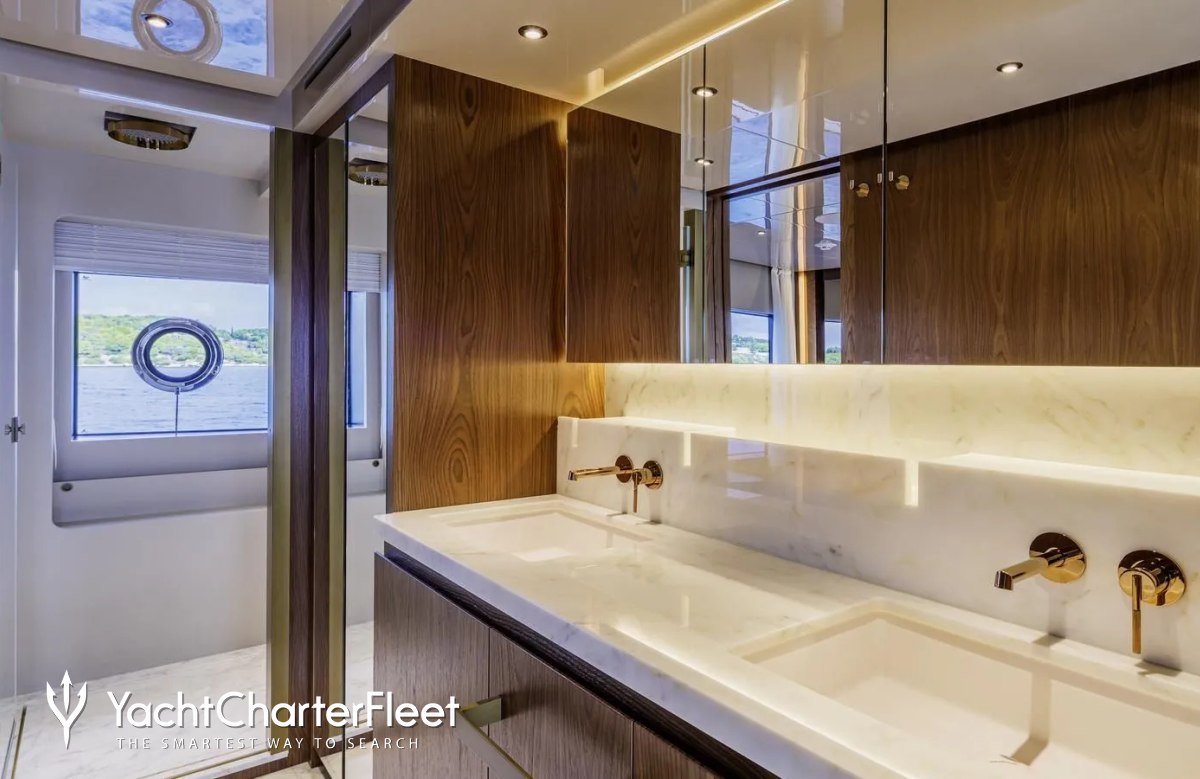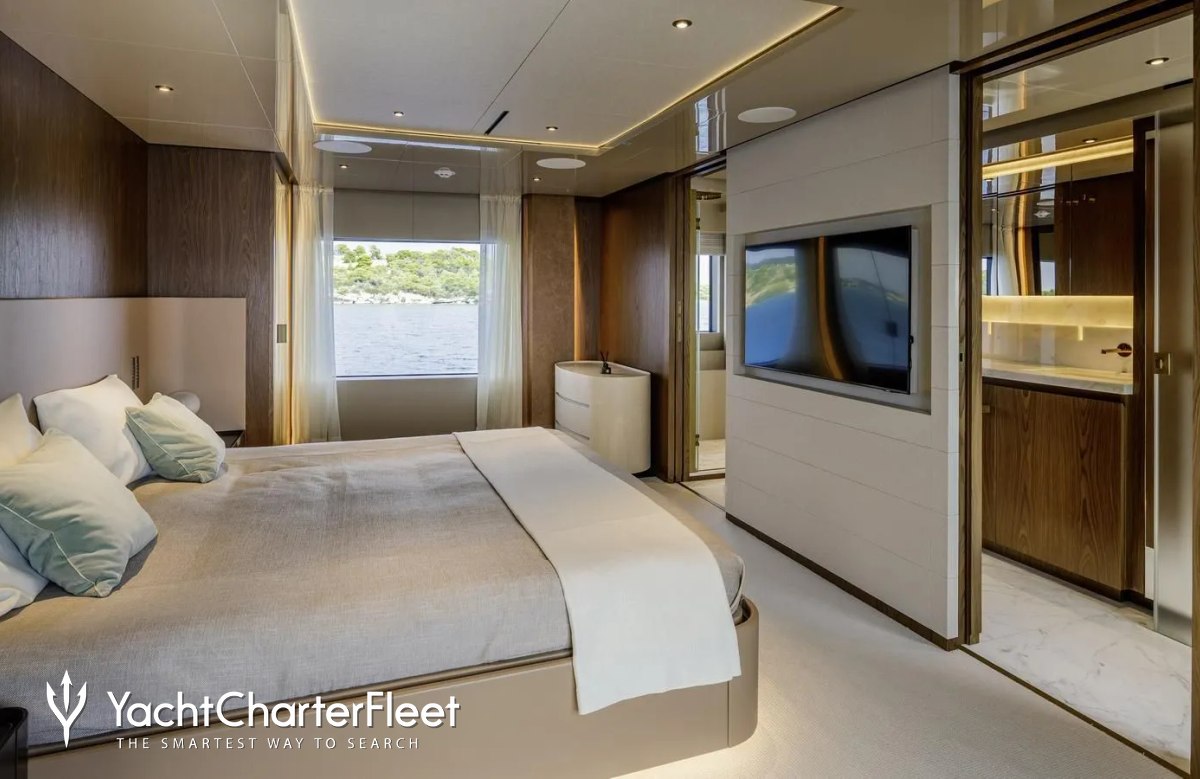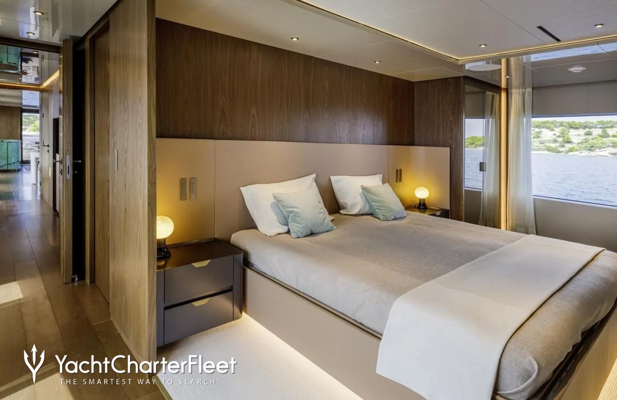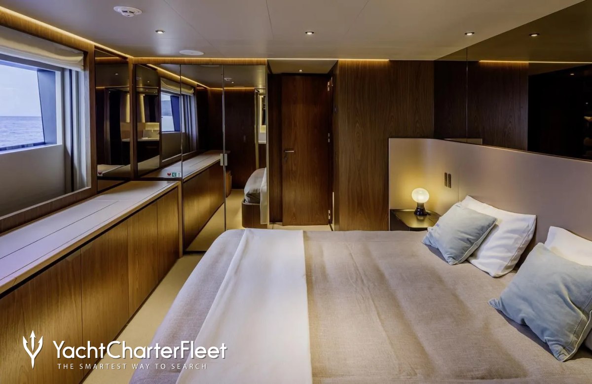 Quant offers guest accommodation for up to 10 guests in 5 suites comprising a master suite located on the main deck, one VIP cabin, one double cabin and two twin cabins. The bed configuration includes 3 doubles and 4 singles. She is also capable of carrying up to 6 crew onboard to ensure a relaxed luxury yacht charter experience.