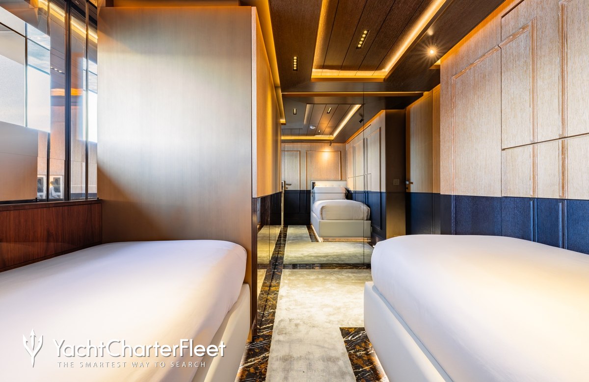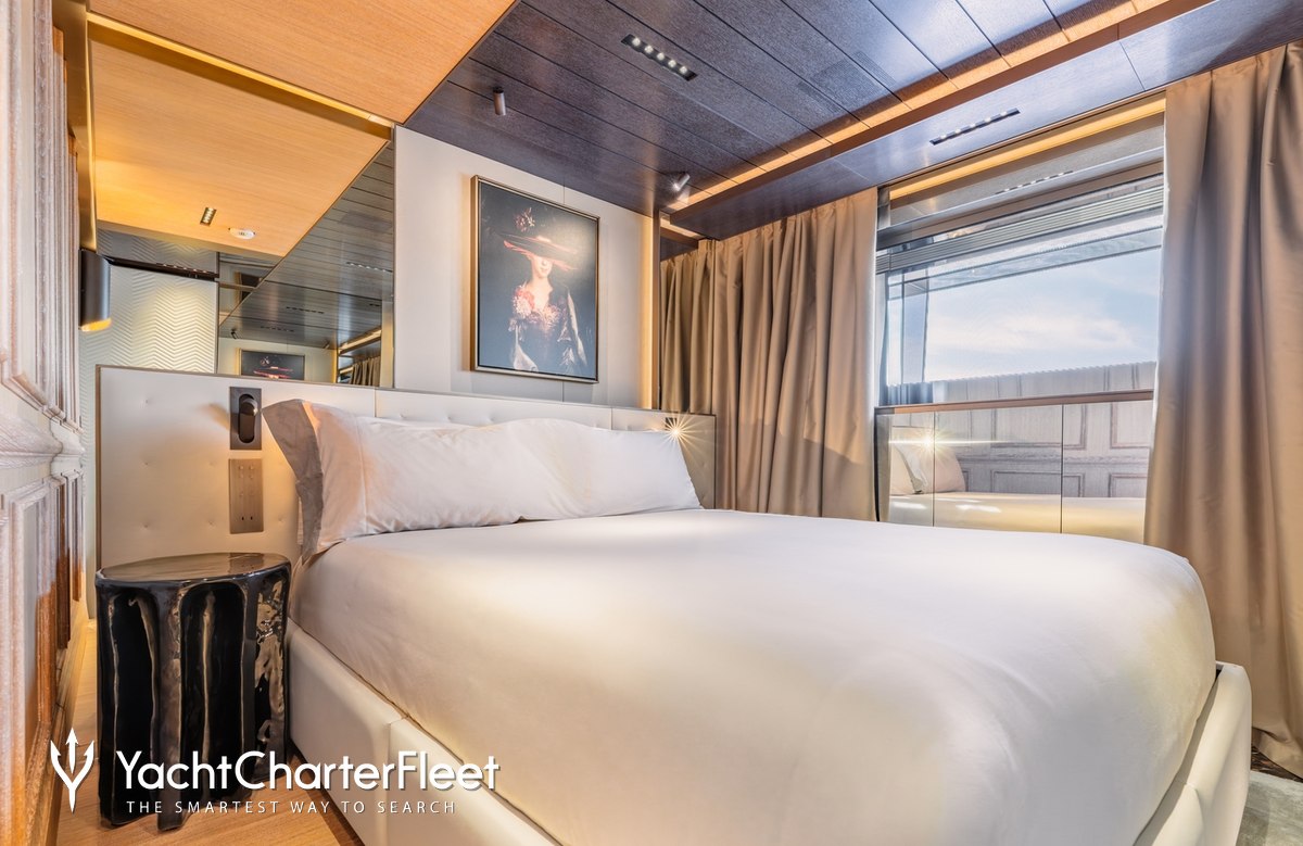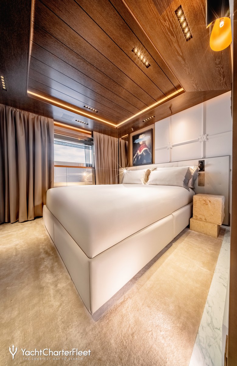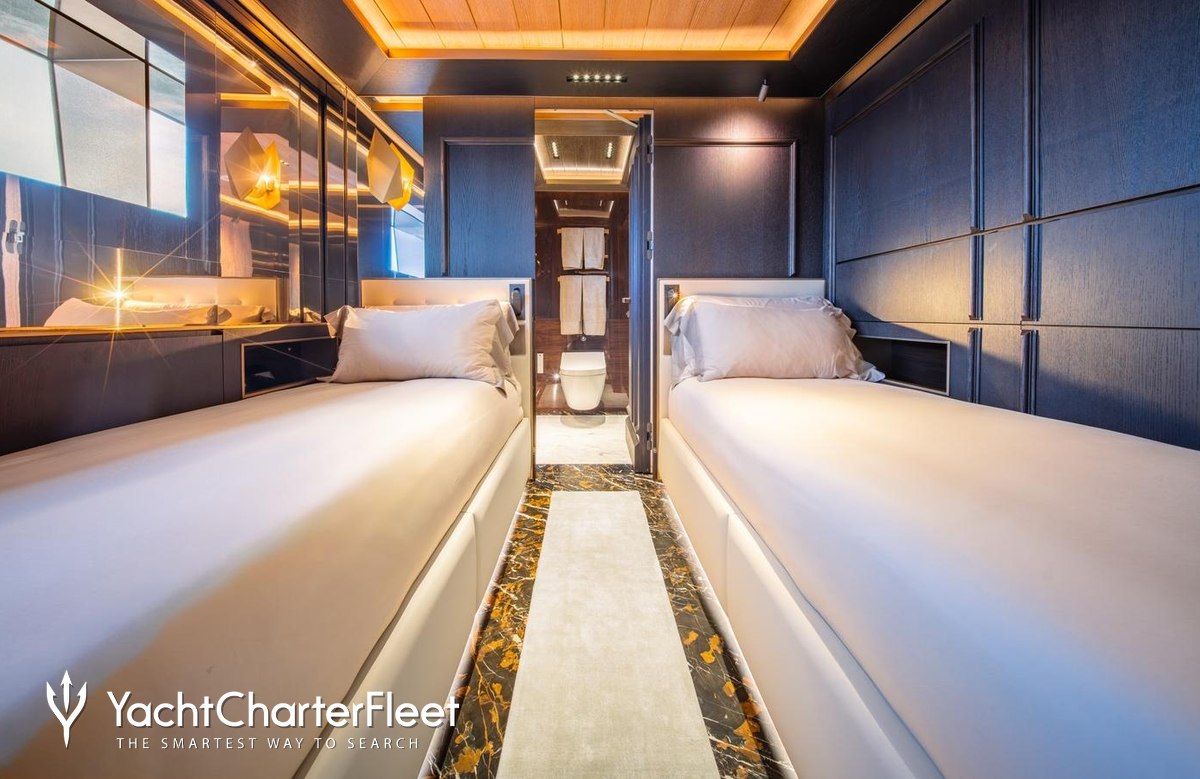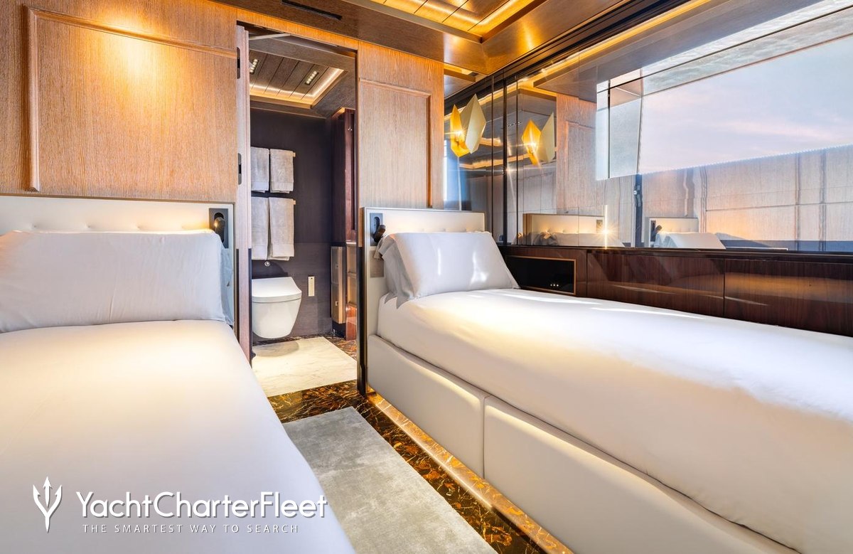 Families will particularly love RAJA² thanks to her child-friendly setup. Built in 2025, She offers guest accommodation for up to 12 guests with a layout comprising a master suite located on the main deck, one VIP cabin, two double cabins and two twin cabins. There are 10 beds in total, including 1 king, 3 queen, 4 singles and 2 pullmans. She is also capable of carrying up to 12 crew onboard to ensure a relaxed luxury yacht charter experience.