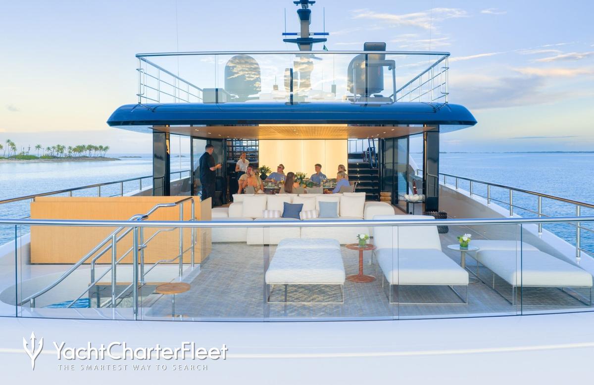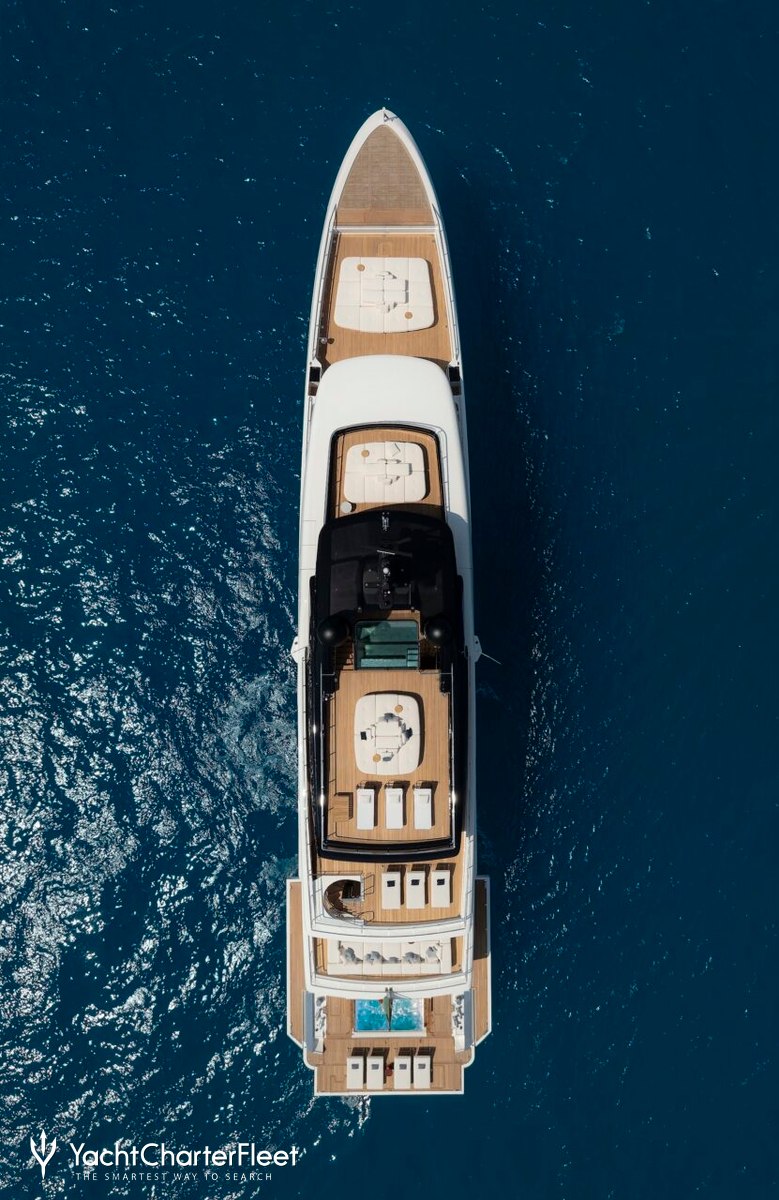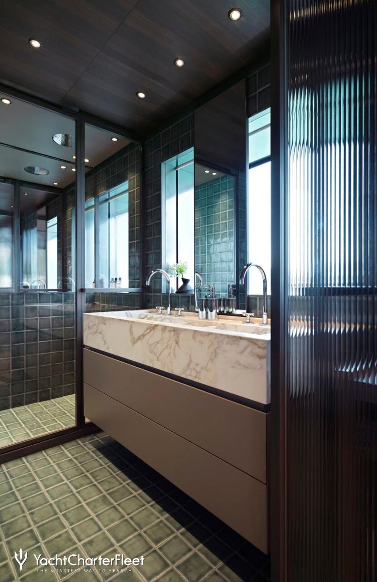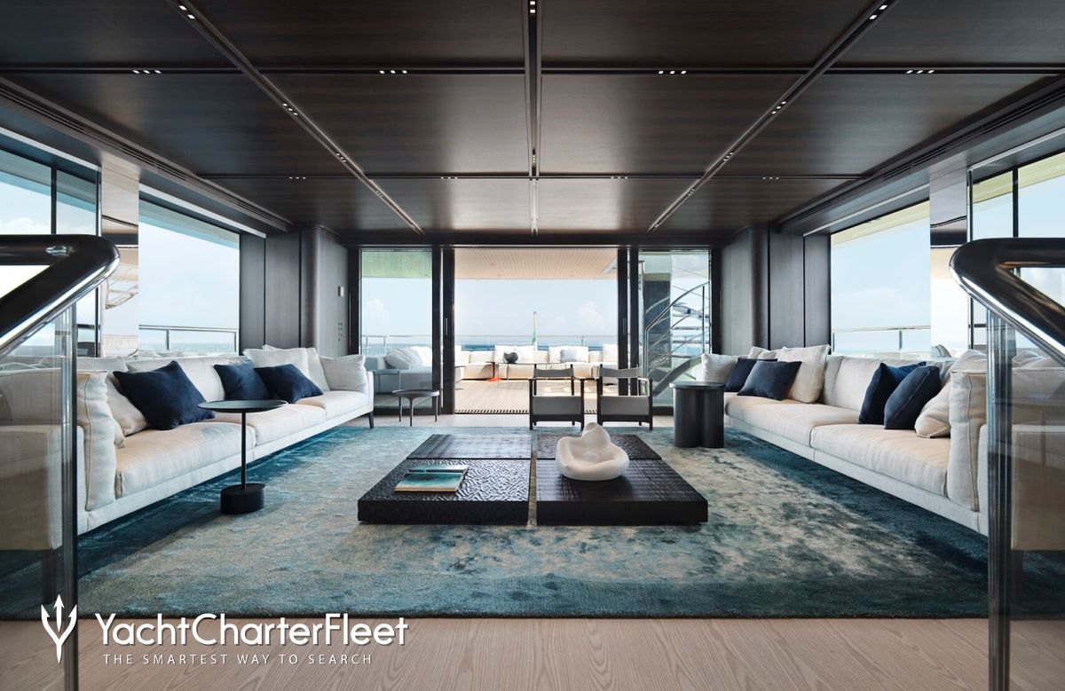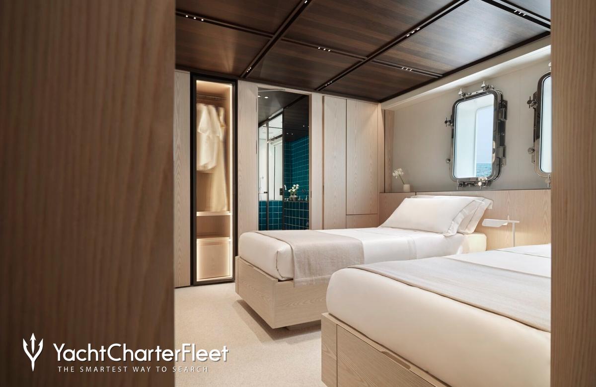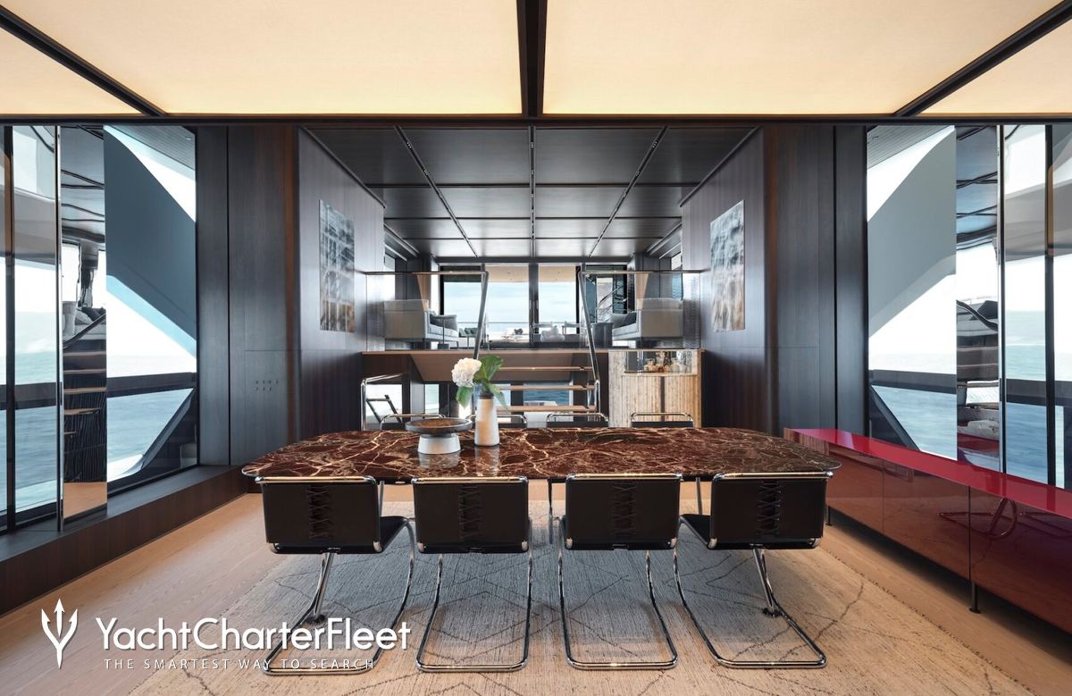 Families will particularly love Contigo thanks to her child-friendly setup. Built in 2024, She offers guest accommodation for up to 10 guests with a layout comprising a master suite and four double cabins. The master suite incorporates its own study and dressing room. The bed configuration includes 1 king, 2 queen, 4 singles and 2 pullmans. She is also capable of carrying up to 11 crew onboard to ensure a relaxed luxury yacht charter experience.