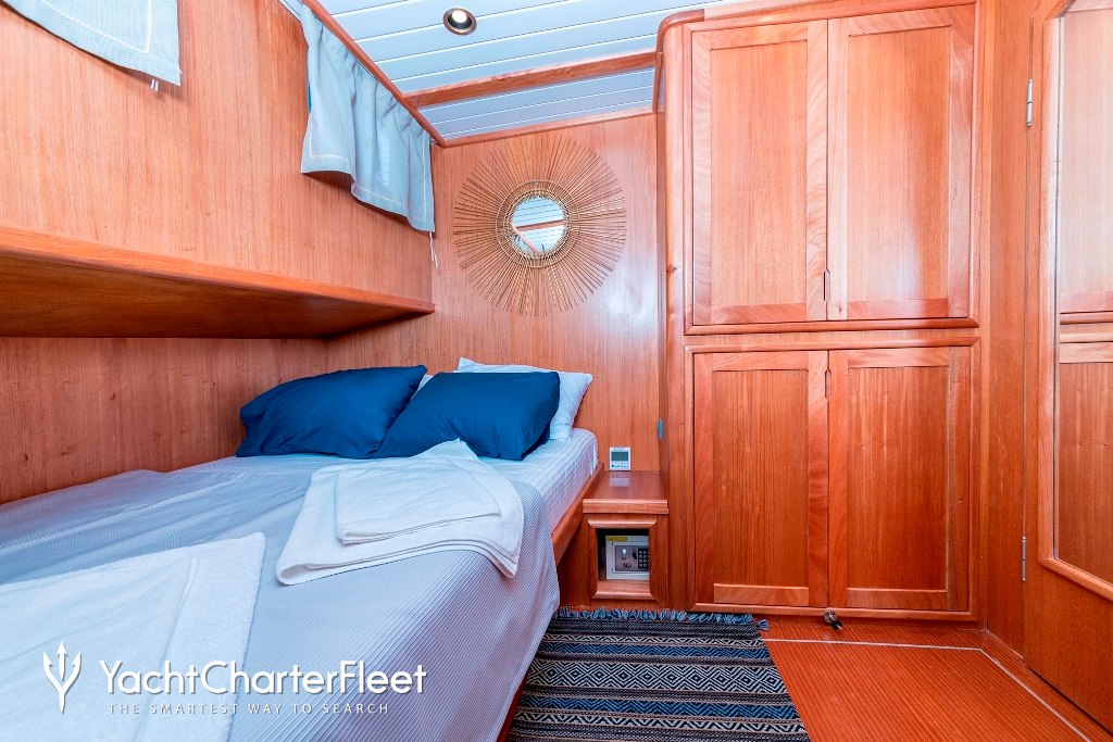 Bodrum Queen offers excellent versatility with her six cabin layout, seldom seem in a charter yacht of her size. Built in 1999, She offers guest accommodation for up to 12 guests with a layout comprising a master suite and four double cabins. She is also capable of carrying up to 4 crew onboard to ensure a relaxed luxury yacht charter experience.