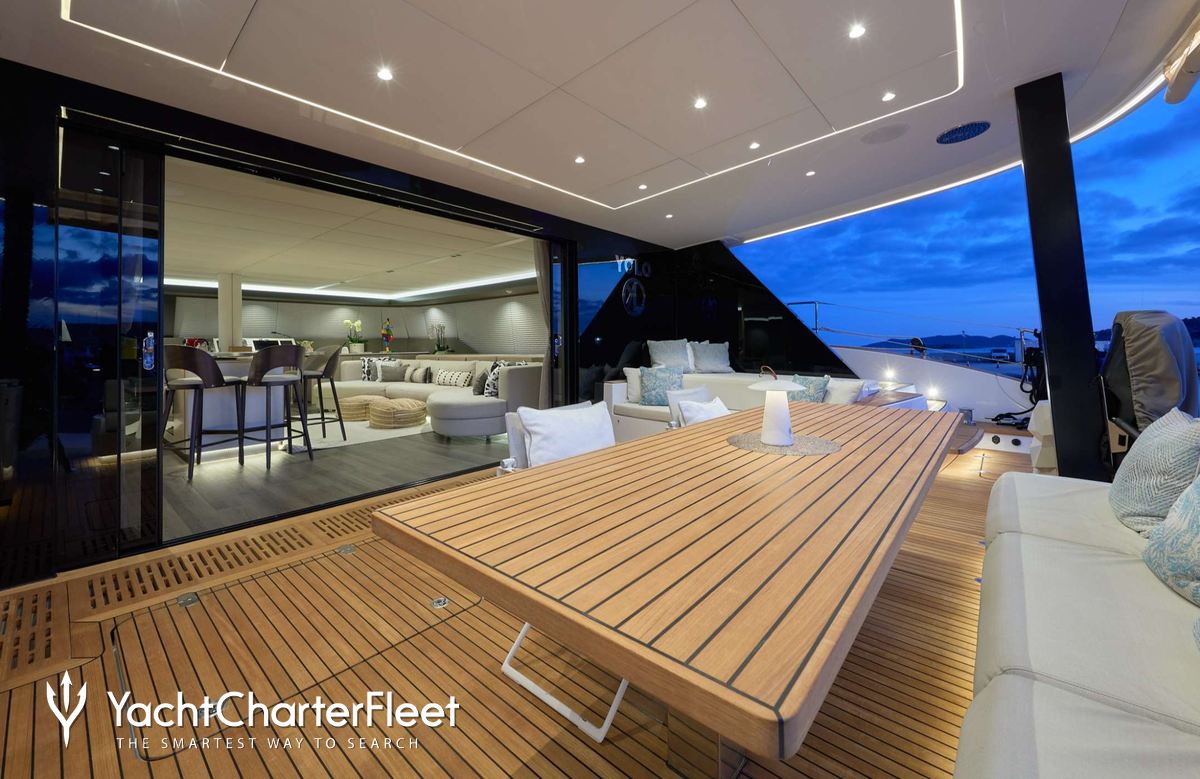 The 22.7m/74'6" catamaran yacht 'Yolo' by the Polish shipyard Sunreef Yachts offers flexible accommodation for up to 8 guests in 4 cabins.