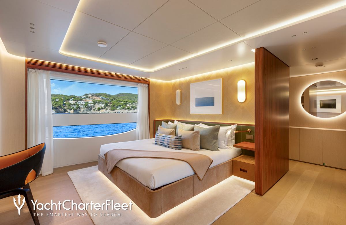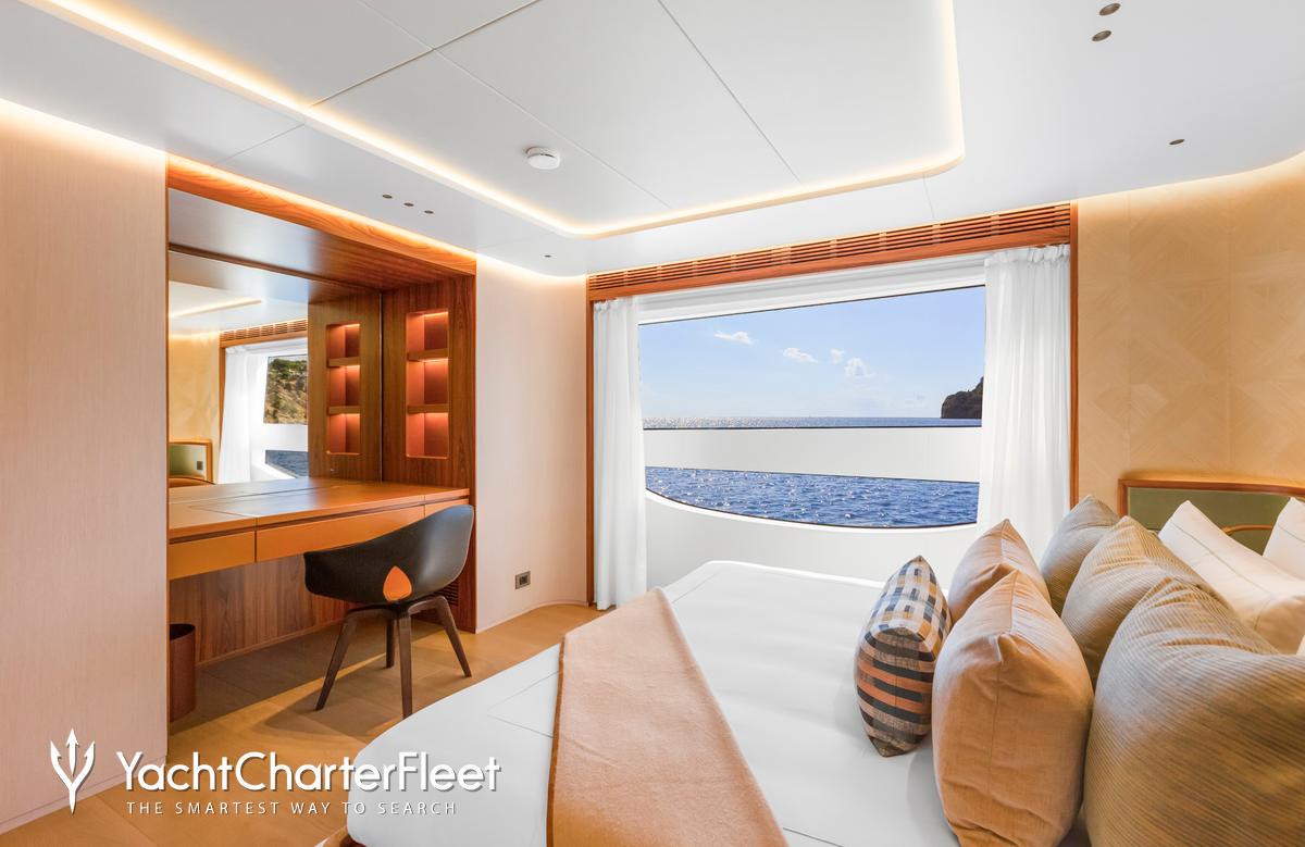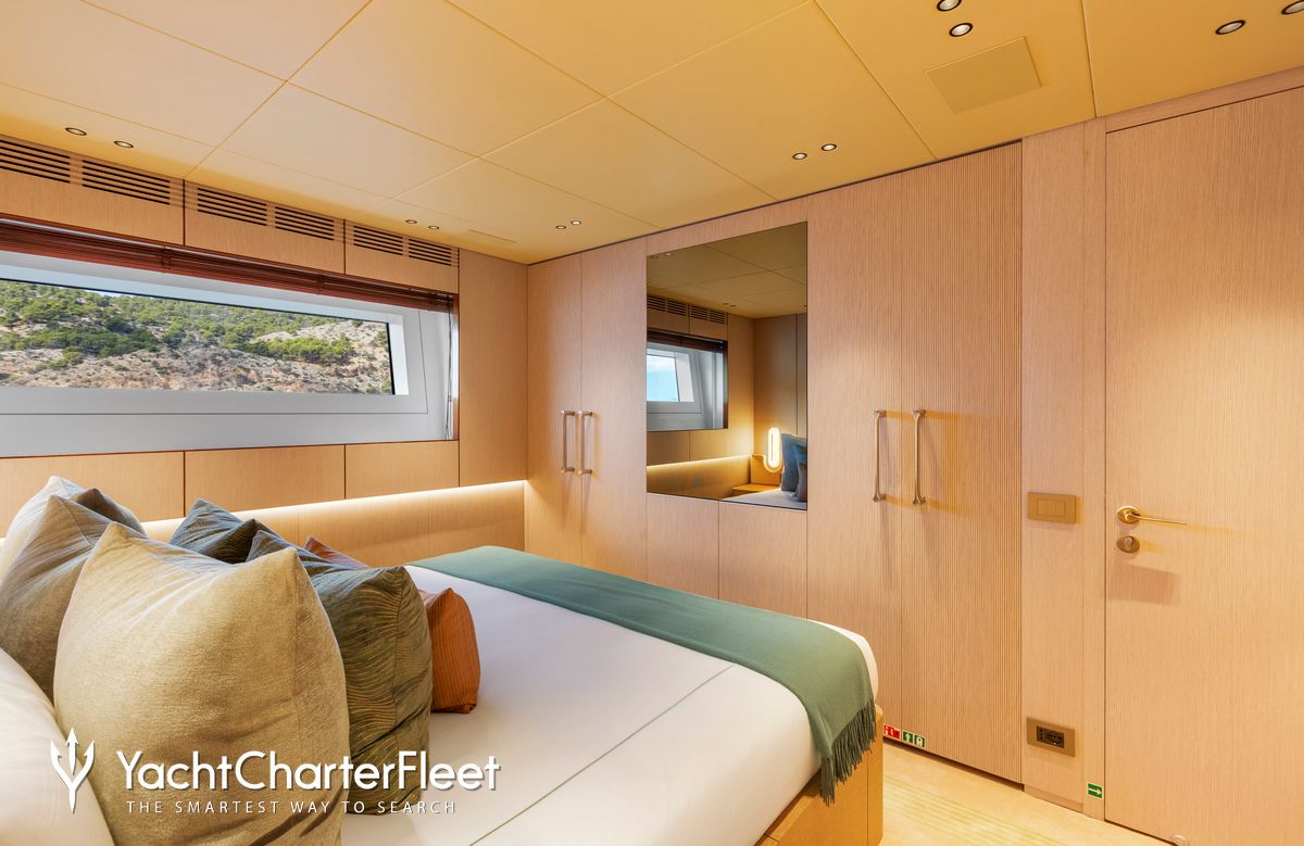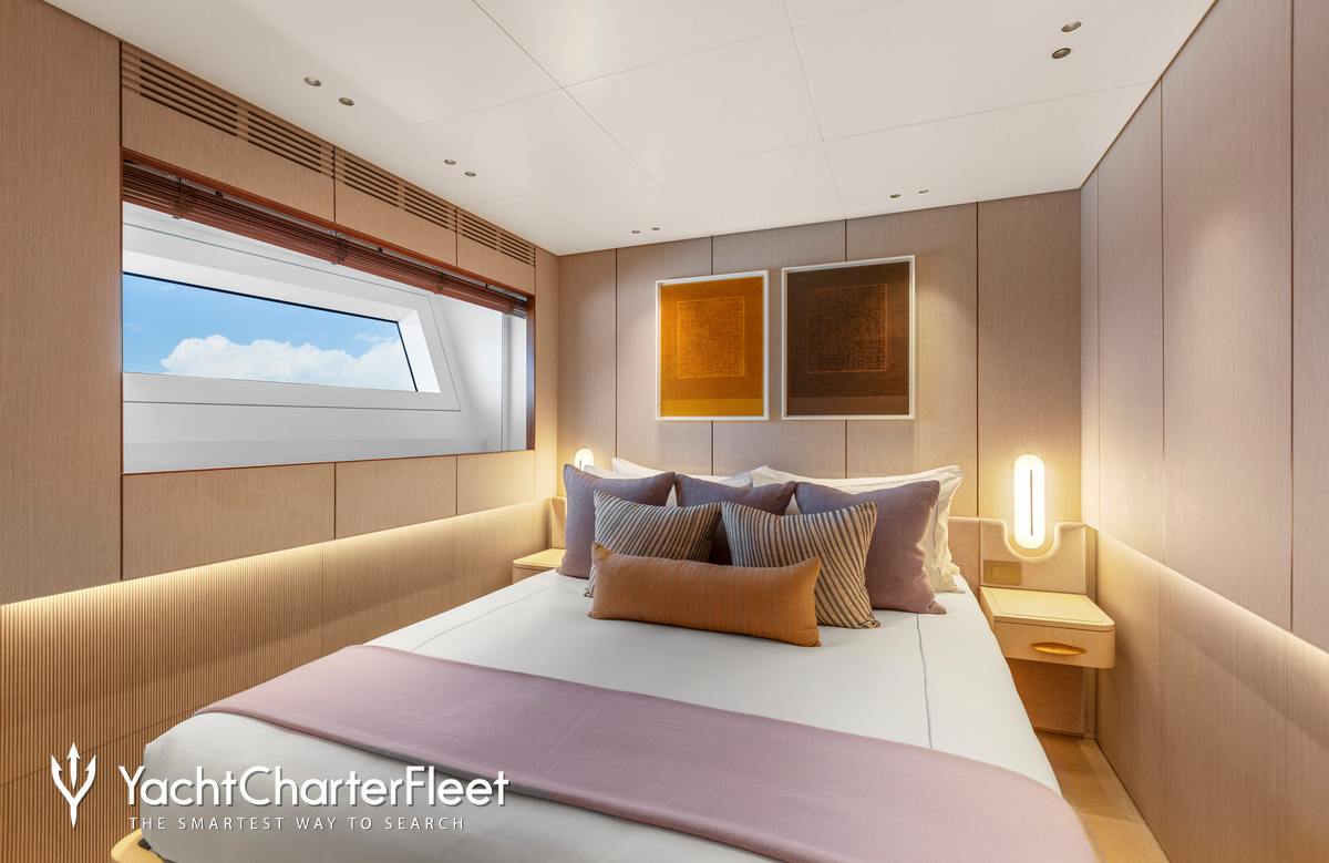 Built in 2025, Liv Love offers guest accommodation for up to 11 guests in 5 suites comprising a master suite located on the main deck, two VIP cabins and one double cabin. The supremely spacious full beam master suite incorporates its own study and dressing room as well as a his and her bathroom. The bed configuration includes 1 convertible. She is also capable of carrying up to 10 crew onboard to ensure a relaxed luxury yacht charter experience.