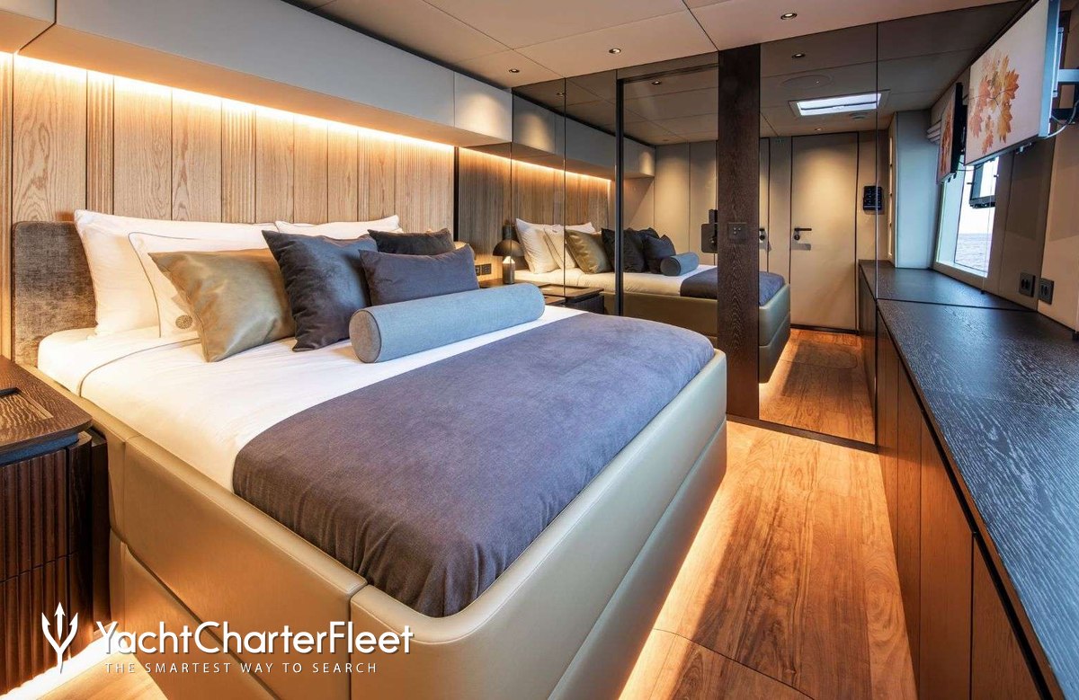 A Plan offers guest accommodation for up to 9 guests in 4 suites comprising a master suite and one VIP cabin. There are 3 beds in total, including 1 king, 2 doubles and 1 convertible. She is also capable of carrying up to 4 crew onboard to ensure a relaxed luxury yacht charter experience.