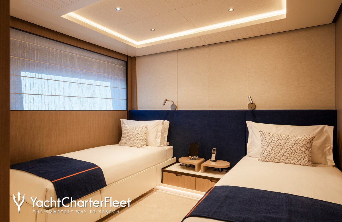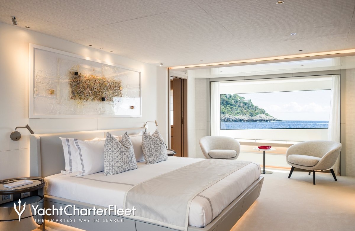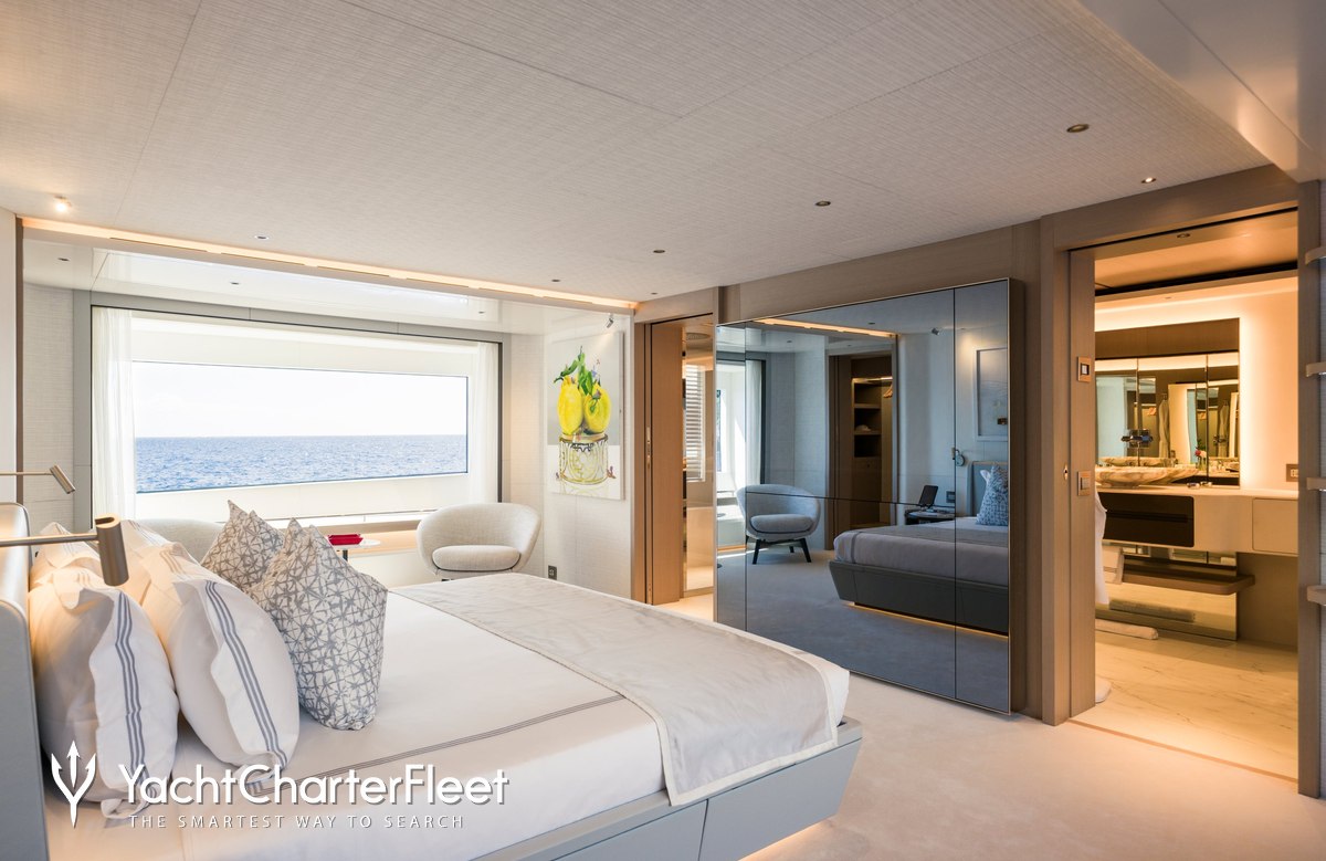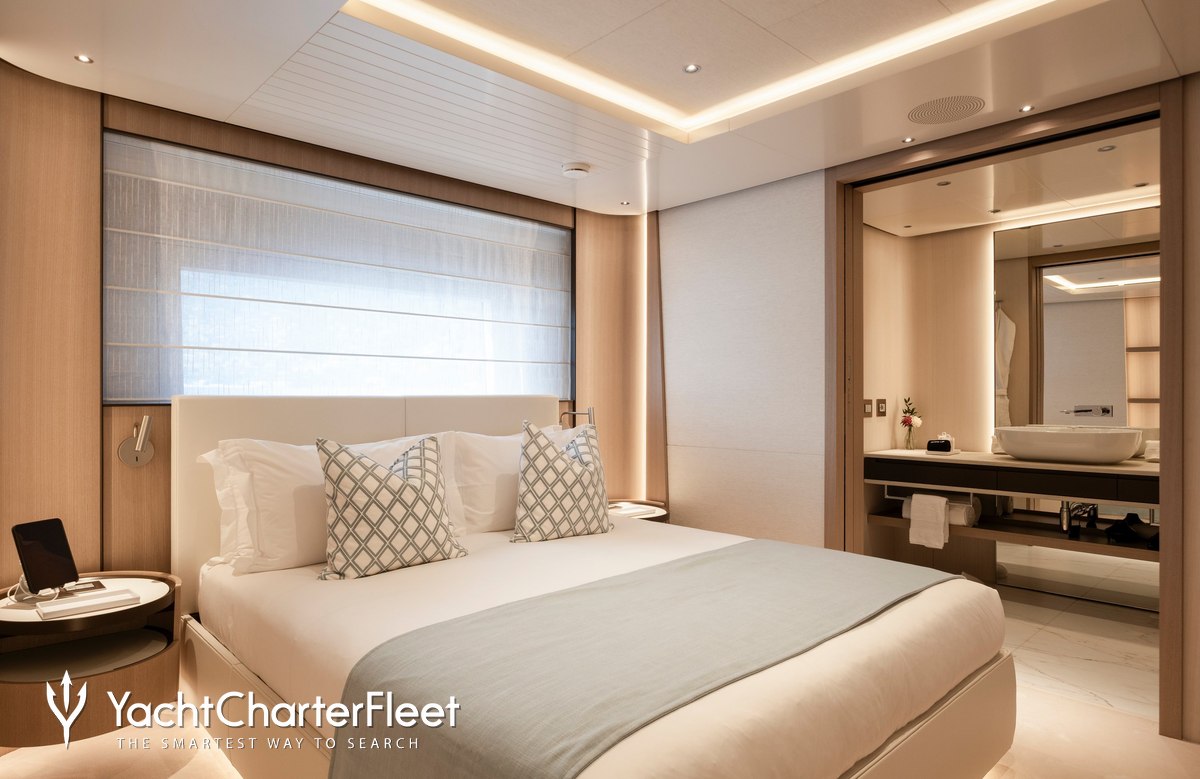 Built in 2025, Fortitude¹ offers guest accommodation for up to 10 guests in 5 suites comprising a master suite located on the main deck, one VIP cabin, one double cabin and one twin cabin. The supremely spacious full beam master suite incorporates its own study. The bed configuration includes 1 convertible. She is also capable of carrying up to 9 crew onboard to ensure a relaxed luxury yacht charter experience.