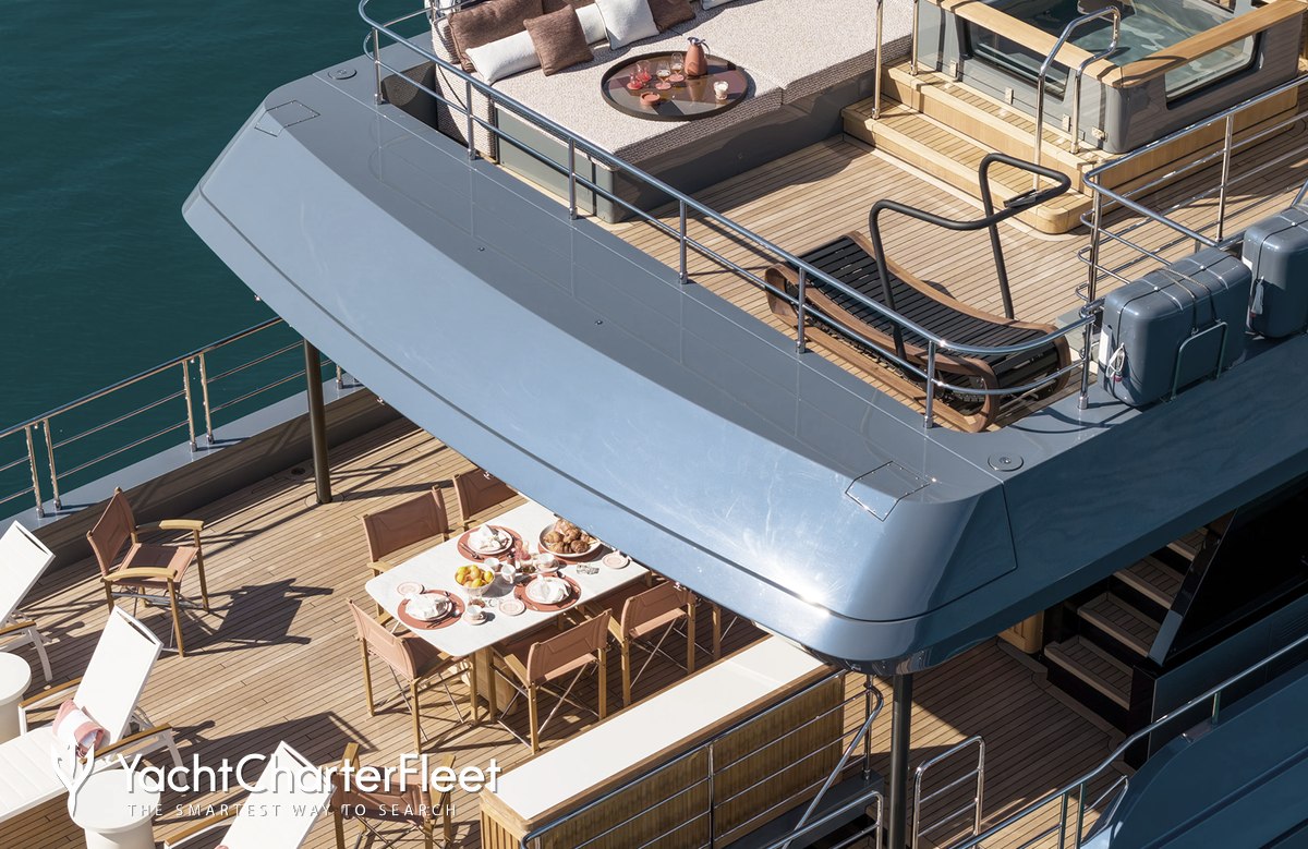 Built with a steel hull and aluminium superstructure, she offers greater on-board space and is more stable when at anchor thanks to her full-displacement hull. Powered by twin Caterpillar engines, she comfortably cruises at 10 knots, reaches a maximum speed of 13 knots with a range of up to 3,960 nautical miles from her 41,866 litre fuel tanks at cruising speed.