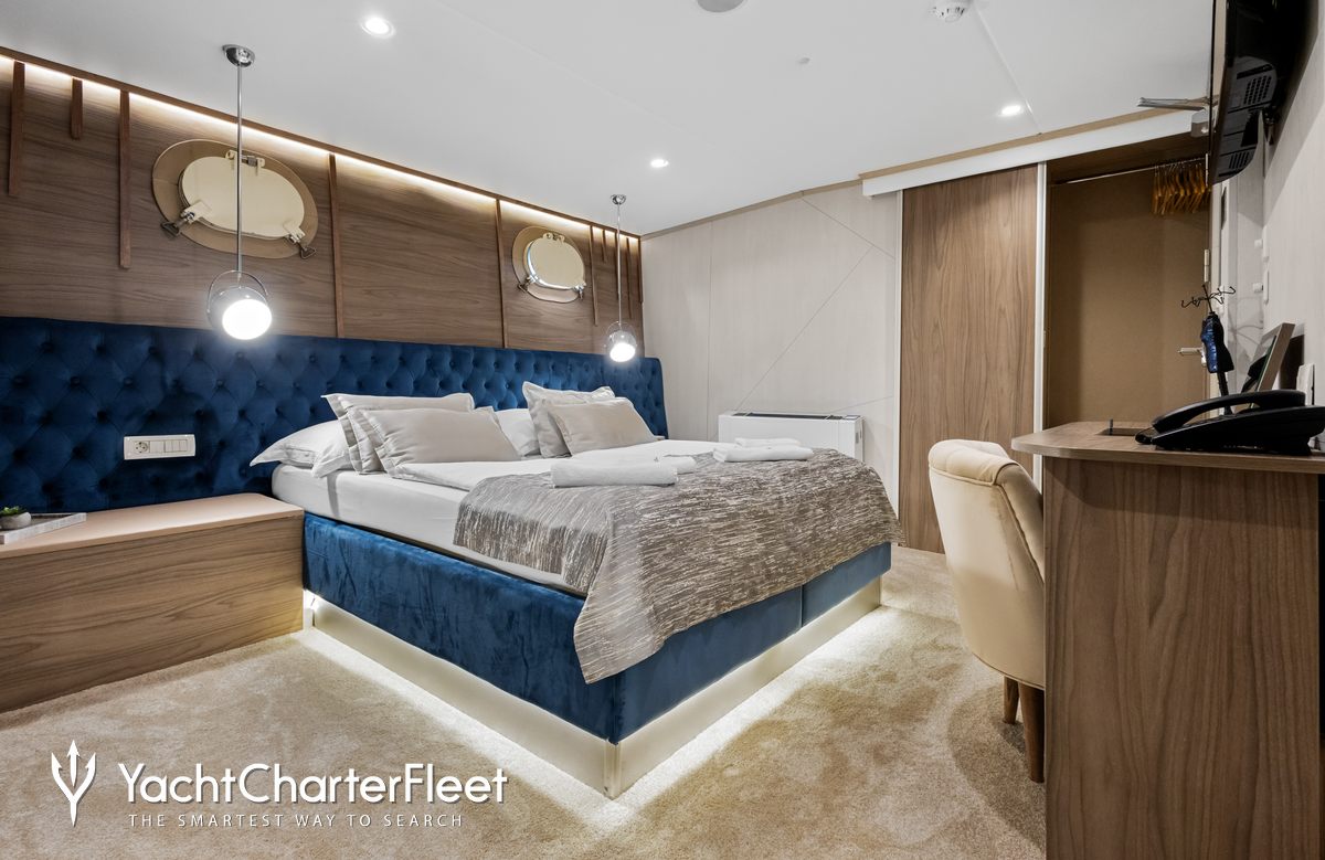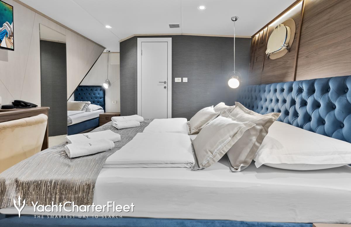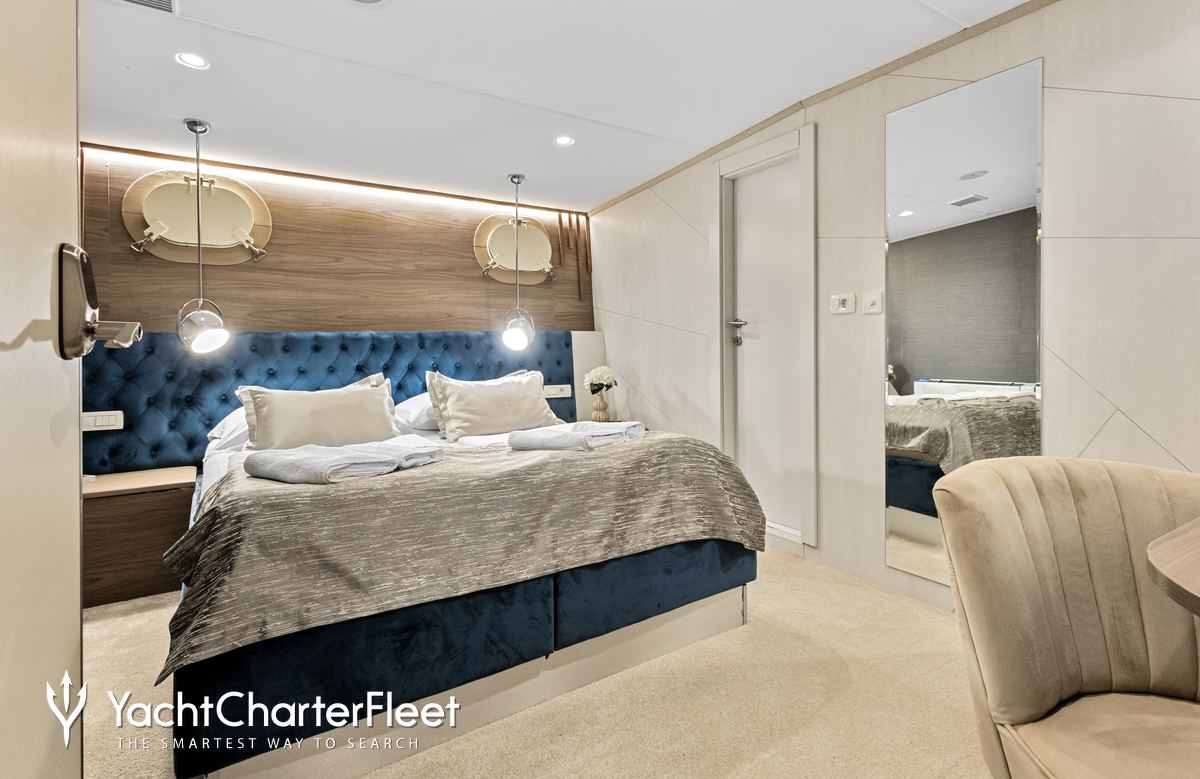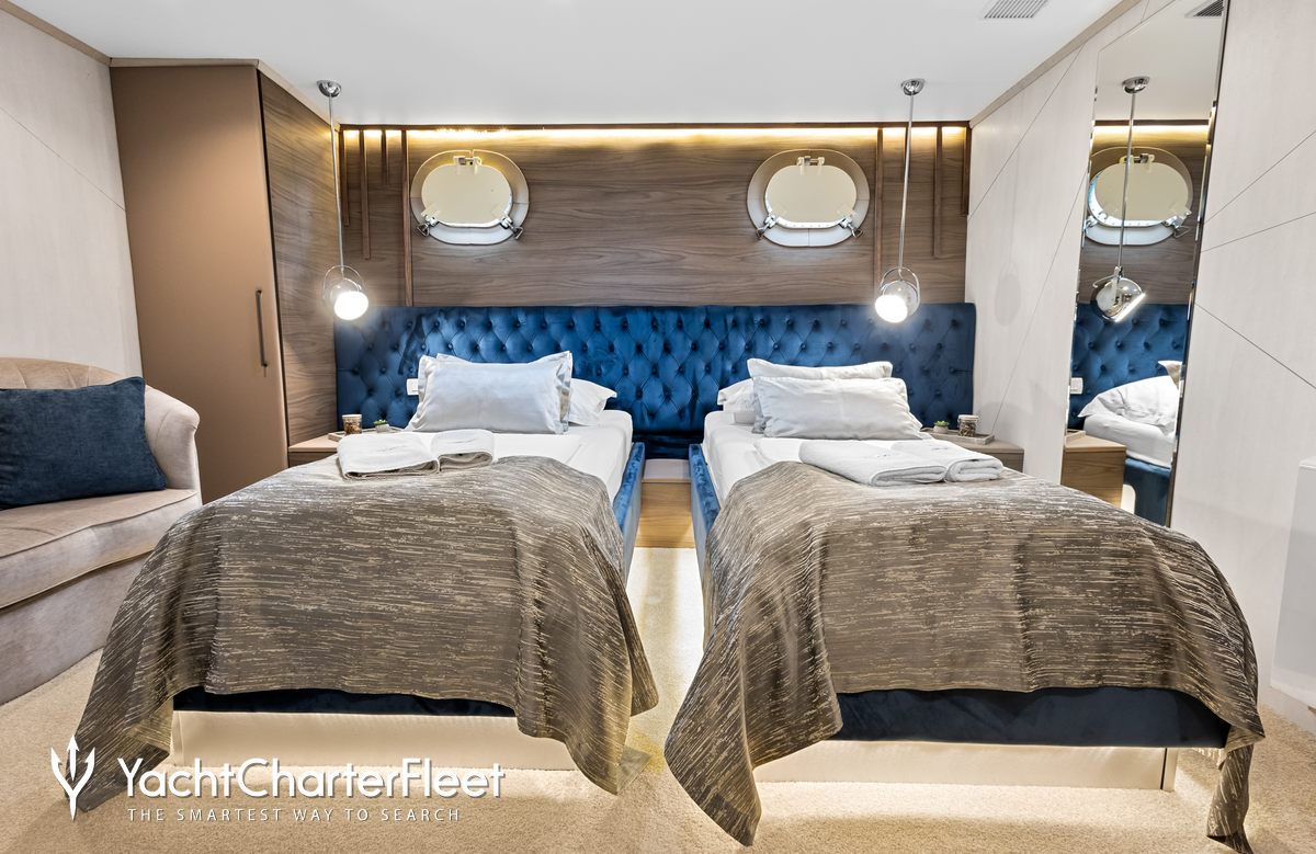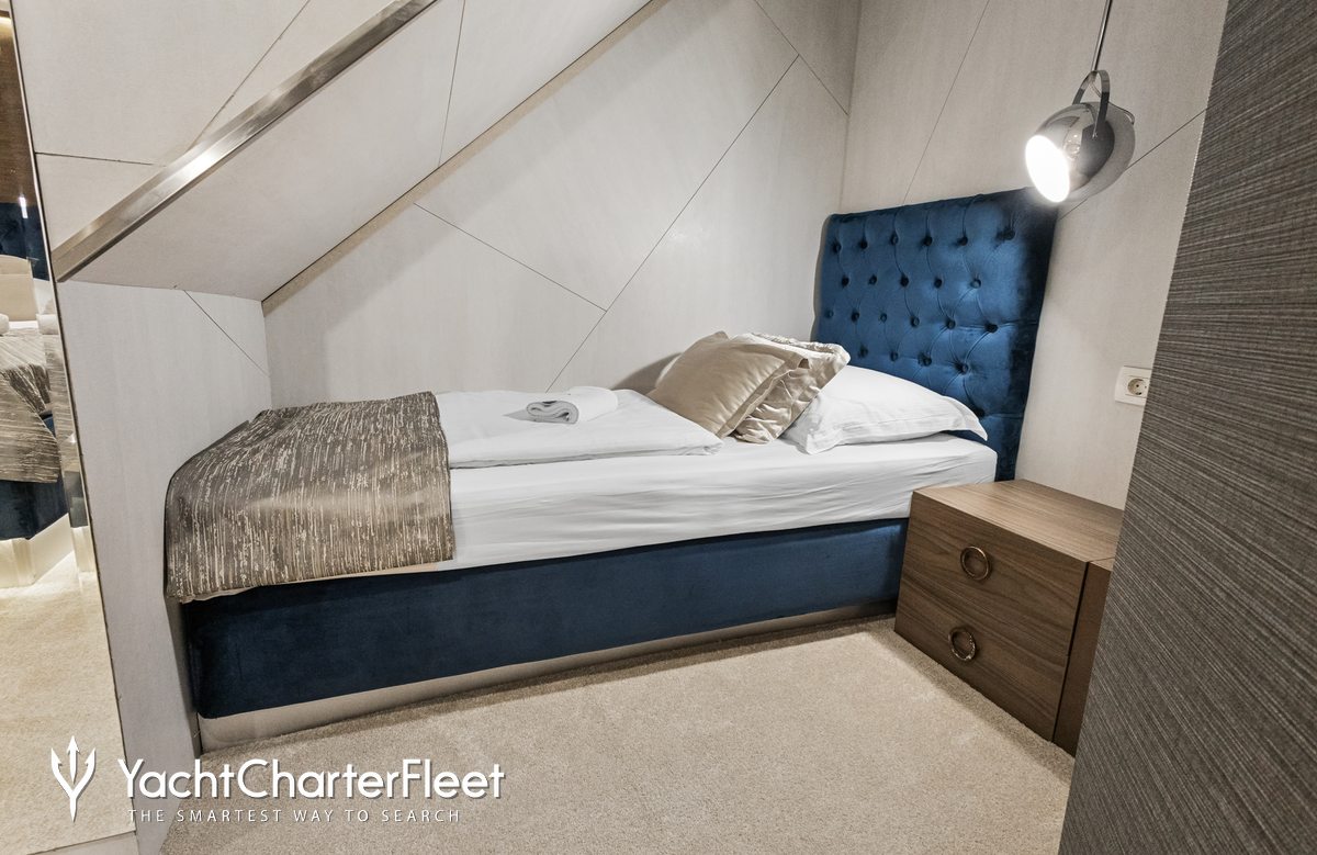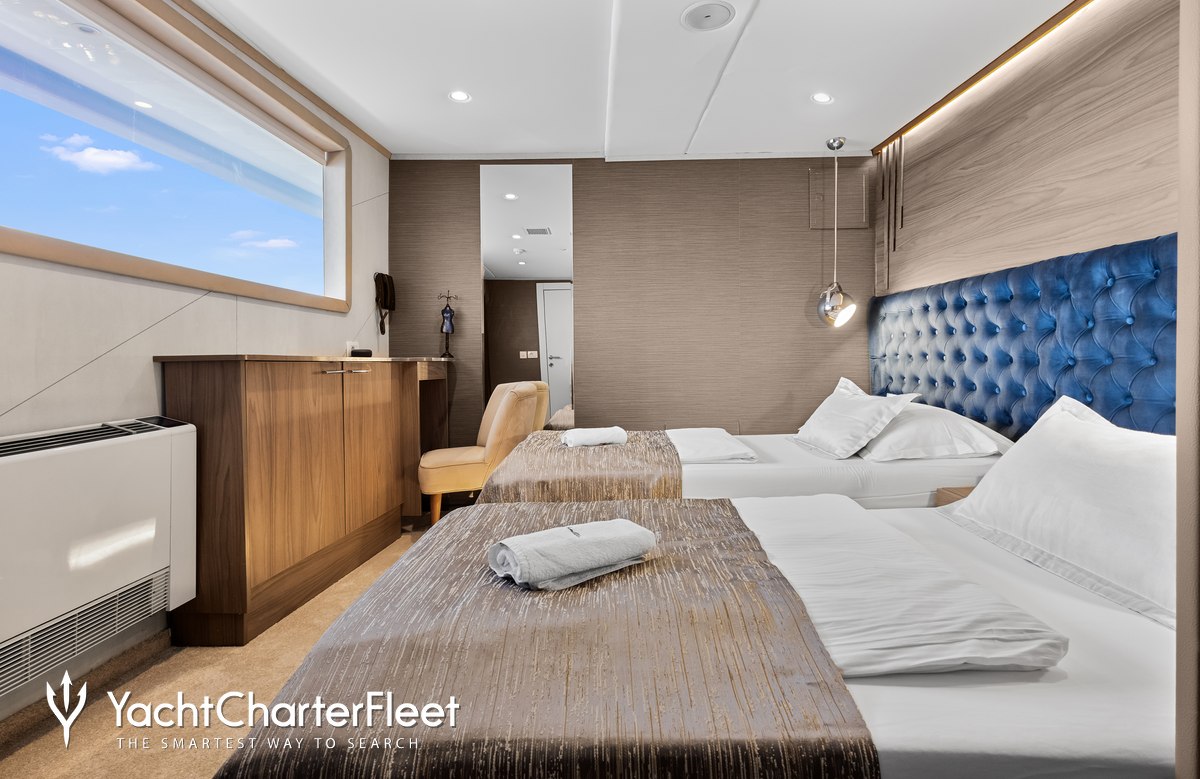 Bella is notable for her ten cabin layout, offering great flexibility for a charter yacht of this size. She offers guest accommodation for up to 21 guests with a layout comprising a master suite, two double cabins, two twin cabins and two cabins that can operate as twins or doubles. She is also capable of carrying up to 12 crew onboard to ensure a relaxed luxury yacht charter experience.