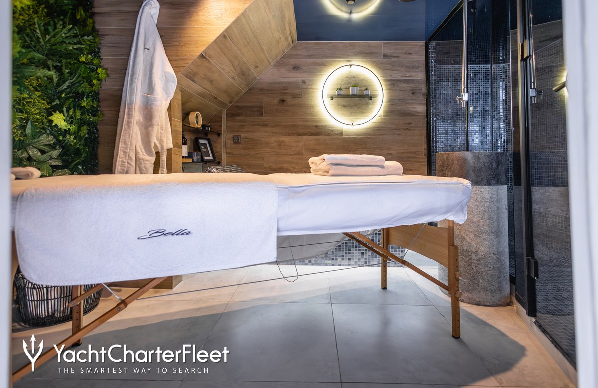 Keeping comfortable and entertained on Bella is easy thanks to the available amenities such as a serene luxury spa, for the utmost in relaxation. Revive yourself after an intense workout in the sauna and in addition sit back with a glass of champagne in the deck jacuzzi.