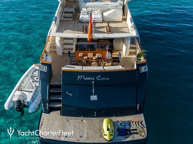 The 24m/78'9" 'Mr Corn' open yacht built by the Spanish shipyard Rodman is available for charter for up to 10 guests in 4 cabins.