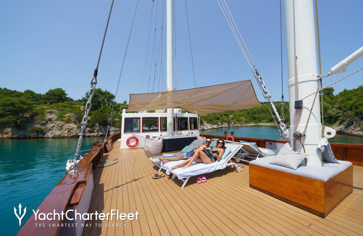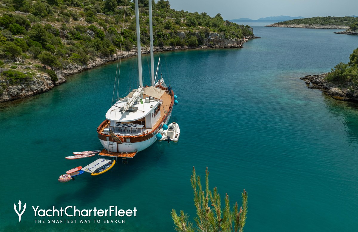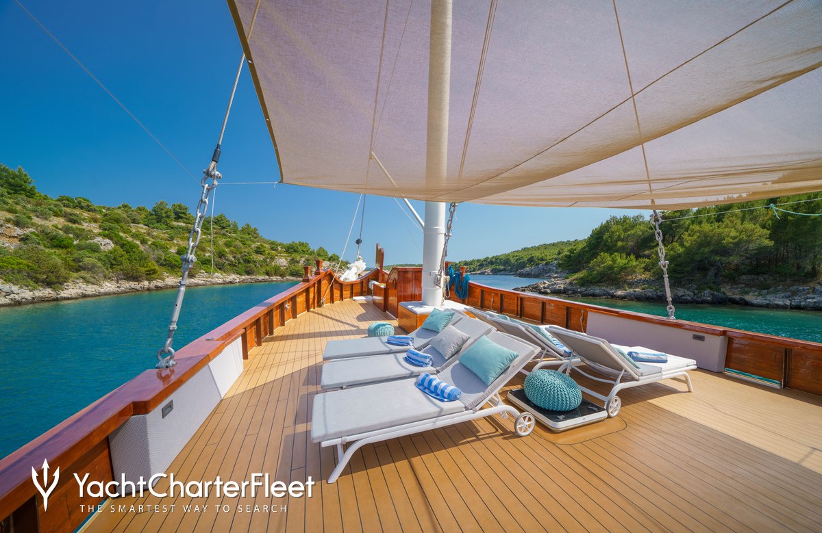 The 27.65m/90'9" gulet yacht 'Green Ray' by shipyard Custom offers flexible accommodation for up to 12 guests in 6 cabins.