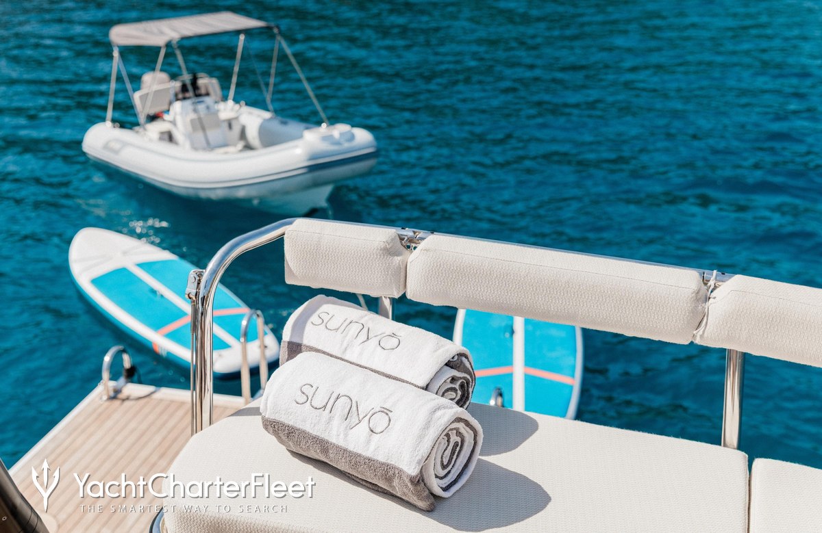 Set against the backdrop of your chosen cruising ground, you and your guests can enjoy fun on the water with the collection of water toys and accessories aboard Sunyo. If that isn't enough Sunyo also features fishing equipment, paddleboards and snorkelling equipment. When it's time to travel from land to see, it couldn't be easier with a 4.75m/15'7" AB Inflatables Tender.