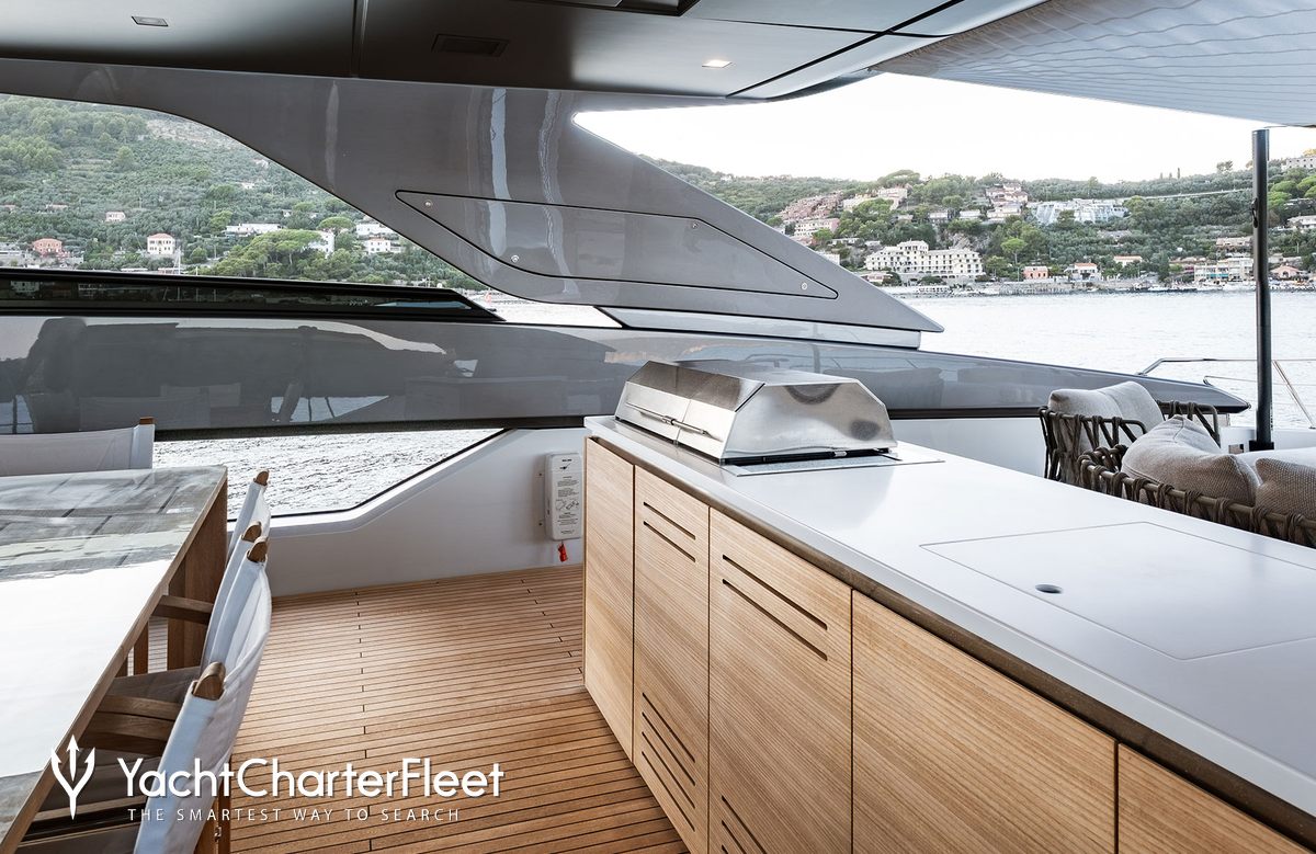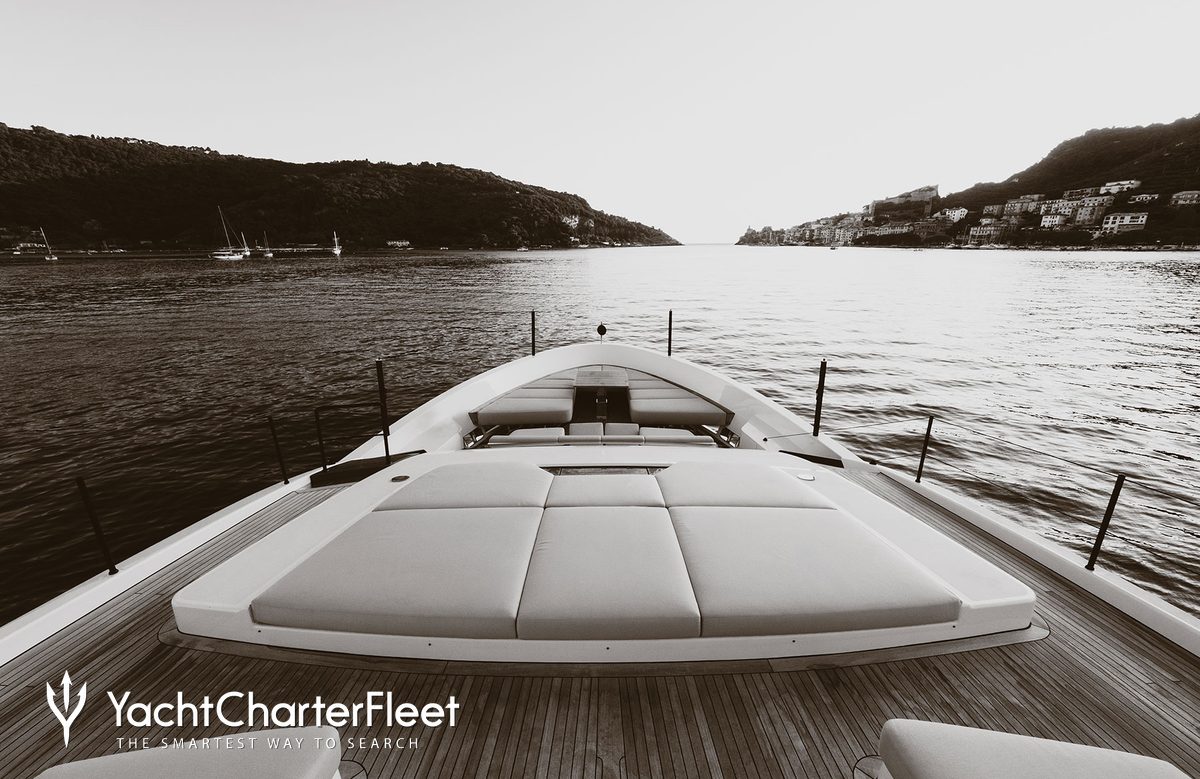 Built with a GRP hull and GRP superstructure, with teak decks, she benefits from a semi-displacement hull to provide exceptional seakeeping and impressive speeds. Powered by twin diesel MTU (16V 2000 M96L) 16-cylinder 2,636hp engines, she comfortably cruises at 11 knots, reaches a maximum speed of 27 knots. Her water tanks store around 4,200 Litres of fresh water. She was built to RINA (Registro Italiano Navale) classification society rules.