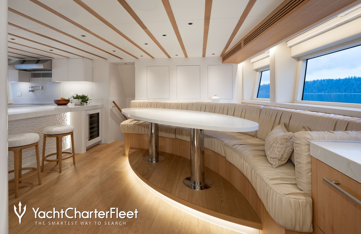 Inside, light woods and white onyx are paired with off-white leather and neutral, textured fabrics, presenting a serene and welcoming ambience throughout the social living and dining areas. The main saloon is designed for relaxation, fitted with twin sofas centered around a fireplace, while forward lies a circular dining table for eight next to a backlit Onyx bar. For more informal gatherings, the nearby California-style galley allows guests to socialize on a large dining settee or at a stone countertop.