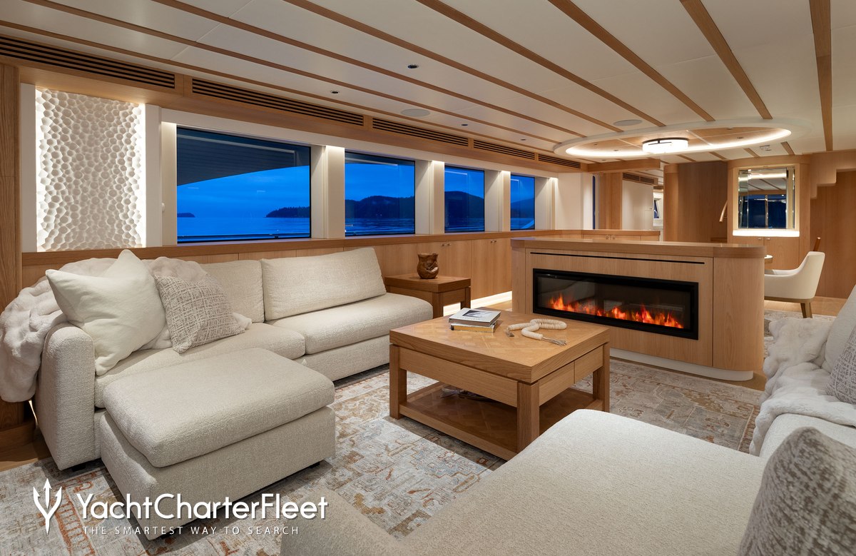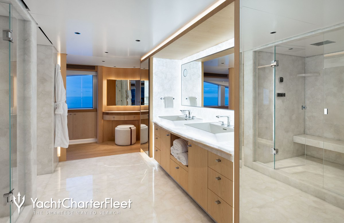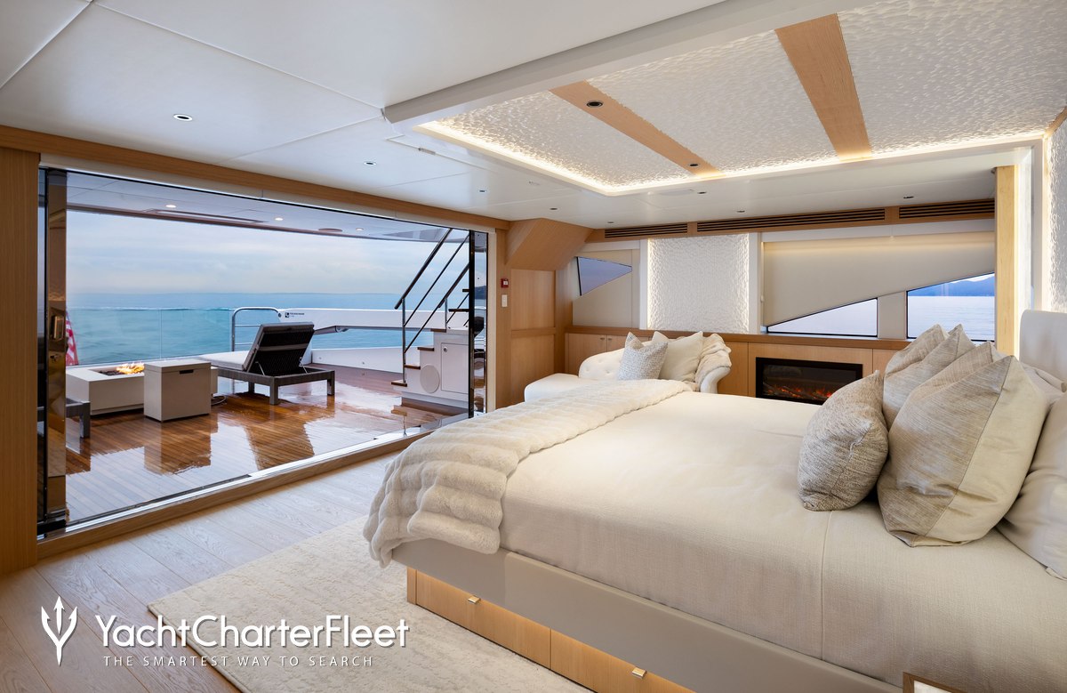 The owner’s "Sky Suite" is situated amidships on the upper deck, featuring expansive views and a private deck with a firepit accessed by an expansive sliding glass door. Additional guest accommodation includes a full-beam VIP suite on the main deck, another full-beam VIP suite and two further cabins on the lower deck