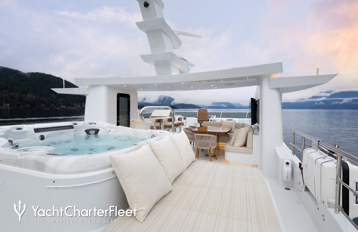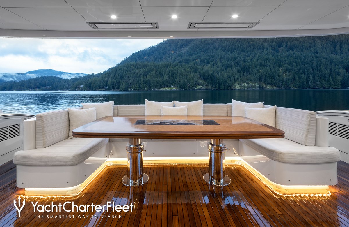 Built with a aluminium hull and aluminium superstructure, she offers greater on-board space and is more stable when at anchor thanks to her full-displacement hull. Powered by twin Caterpillar engines, she comfortably cruises at 12 knots, reaches a maximum speed of 15 knots.