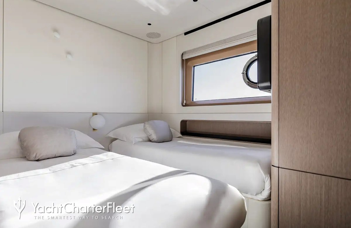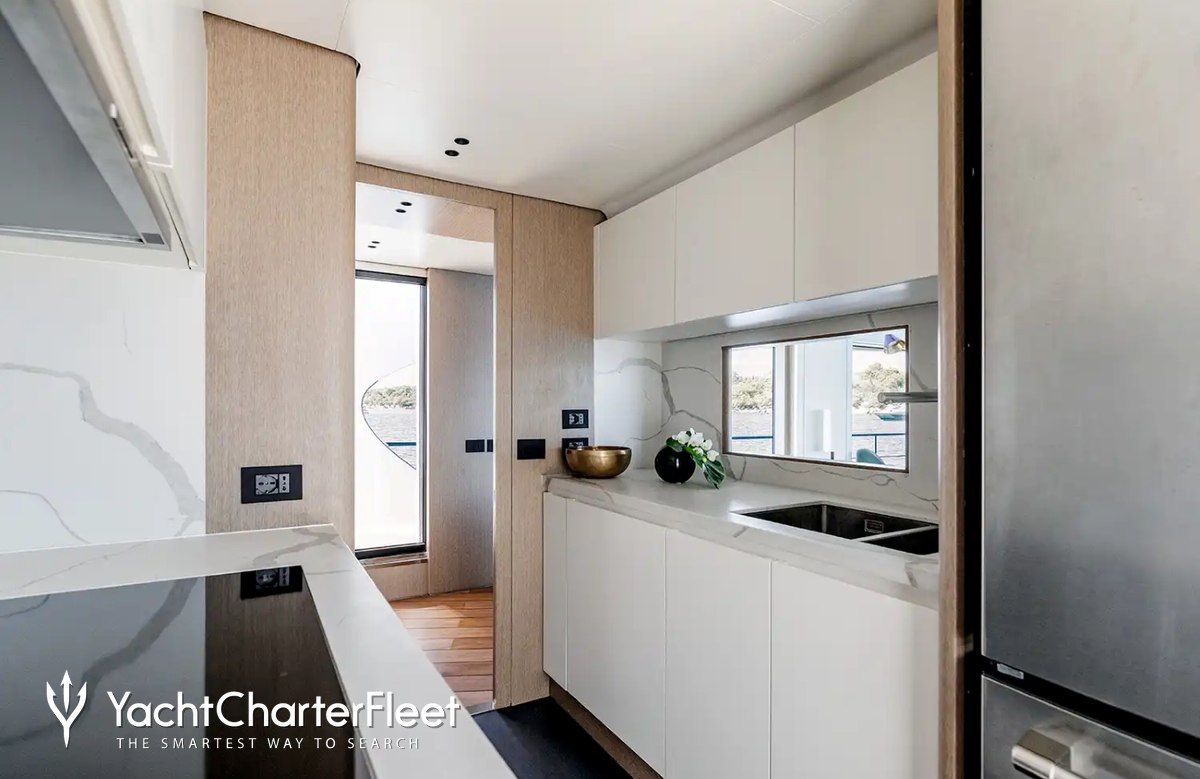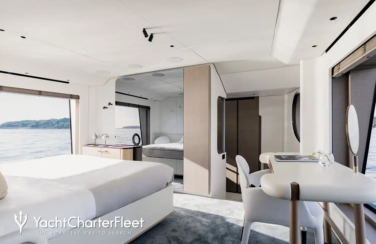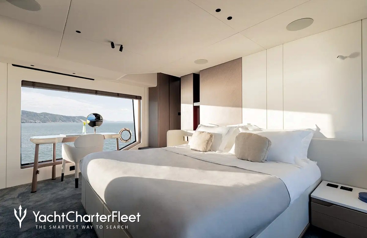 Built in 2025, Getaway offers guest accommodation for up to 10 guests in 5 suites comprising a master suite located on the main deck, two double cabins and two twin cabins. She is also capable of carrying up to 3 crew onboard to ensure a relaxed luxury yacht charter experience.