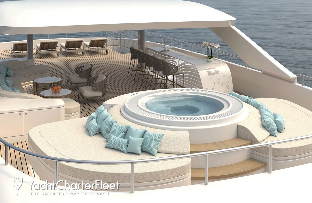 A charter on Oriy is comfortable and convenient thanks to the provided amenities such as a sauna to help you detox and regenerate. Even the most discerning of charter guests will enjoy the included beach club or maintain your fitness routine and work out in the well-equipped gym. Retreat to the deck jacuzzi and soak up the scenery.