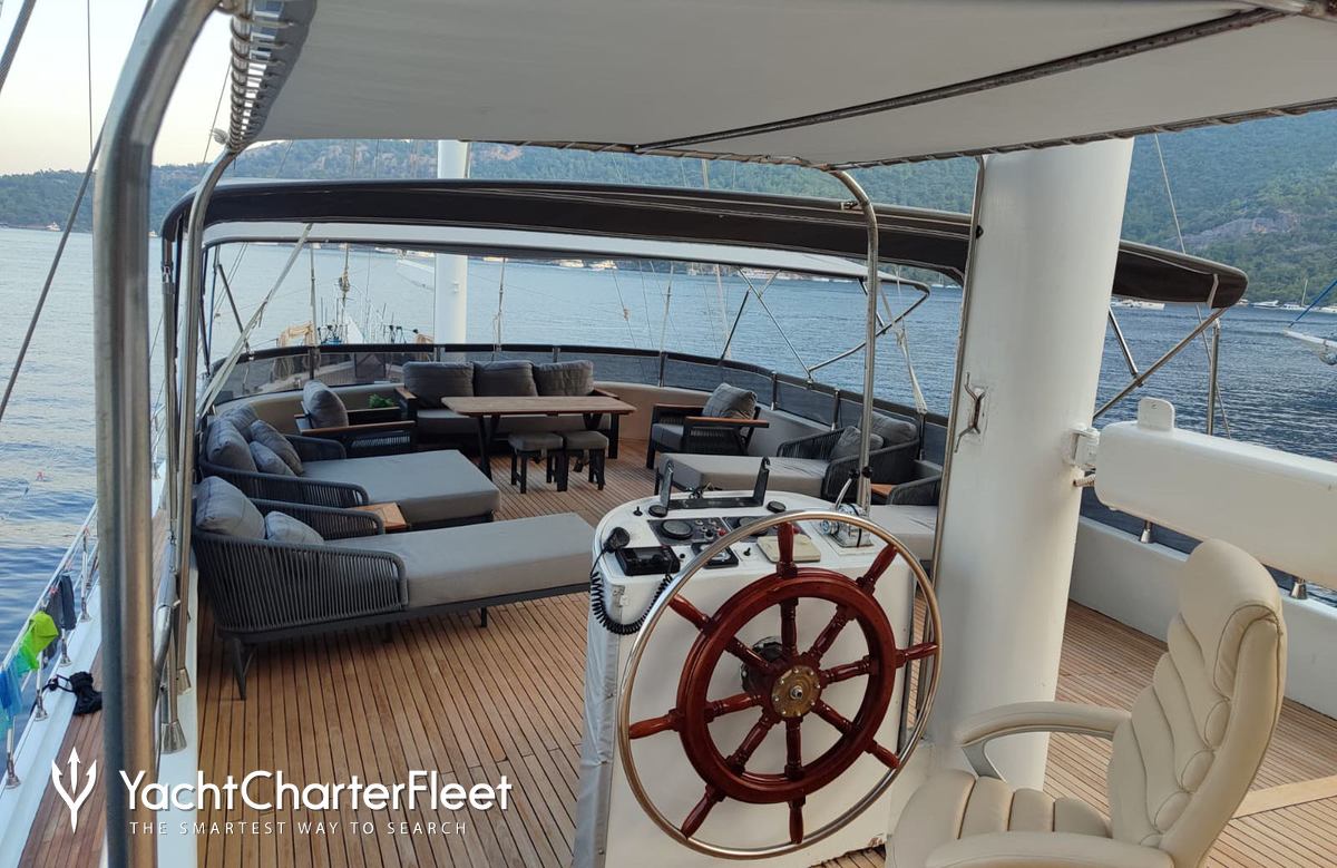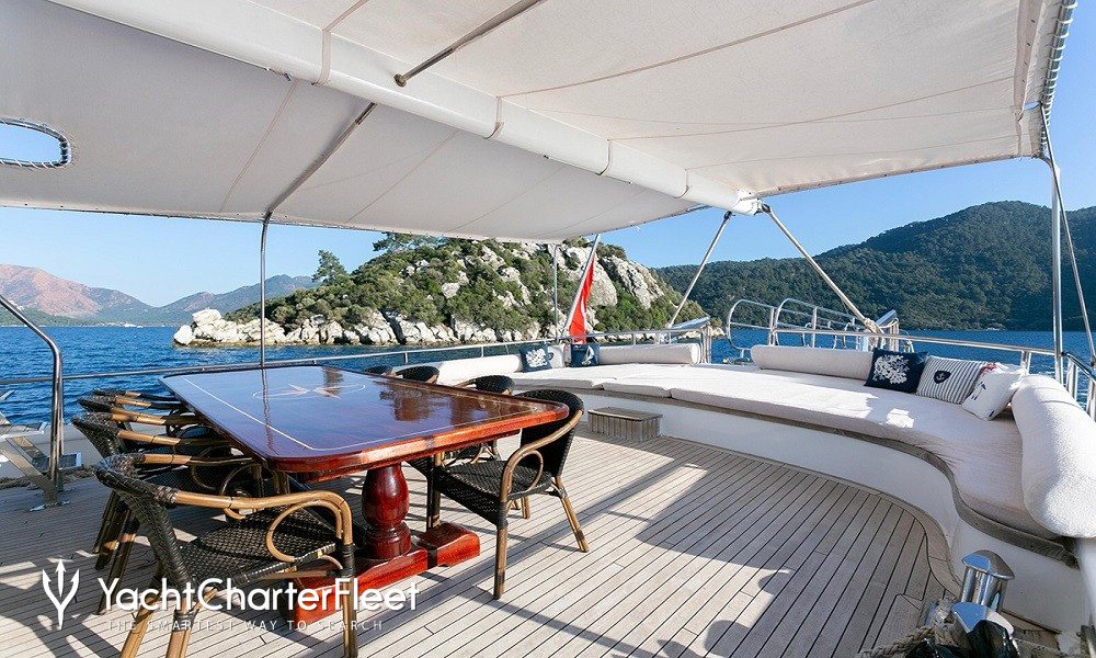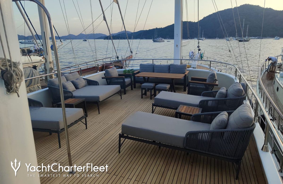 The 35m/114'10" 'Sarayli 1' gulet yacht built by shipyard Custom is available for charter for up to 12 guests in 5 cabins.