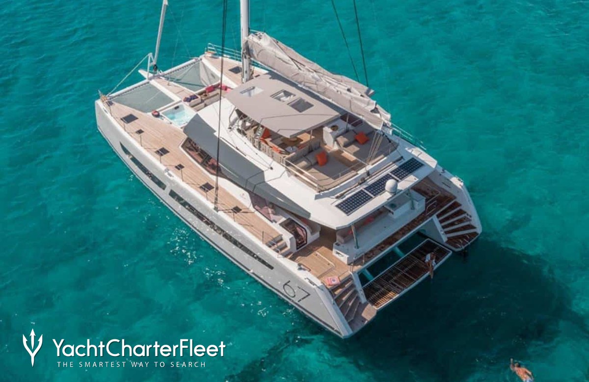 The 20.36m/66'10" 'Inspirante' catamaran yacht built by the French shipyard Fountaine Pajot is available for charter for up to 8 guests in 4 cabins.