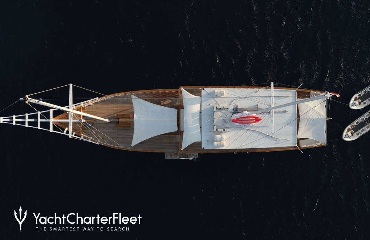 Built with a wood hull and wood superstructure, she offers greater on-board space and is more stable when at anchor thanks to her full-displacement hull. Powered by 1 x Yanmar engines, she comfortably cruises at 9 knots, reaches a maximum speed of 11 knots. With a shallow draft of 2m/6'7" Fenides can anchor closer to coves and sheltered bays overnight.