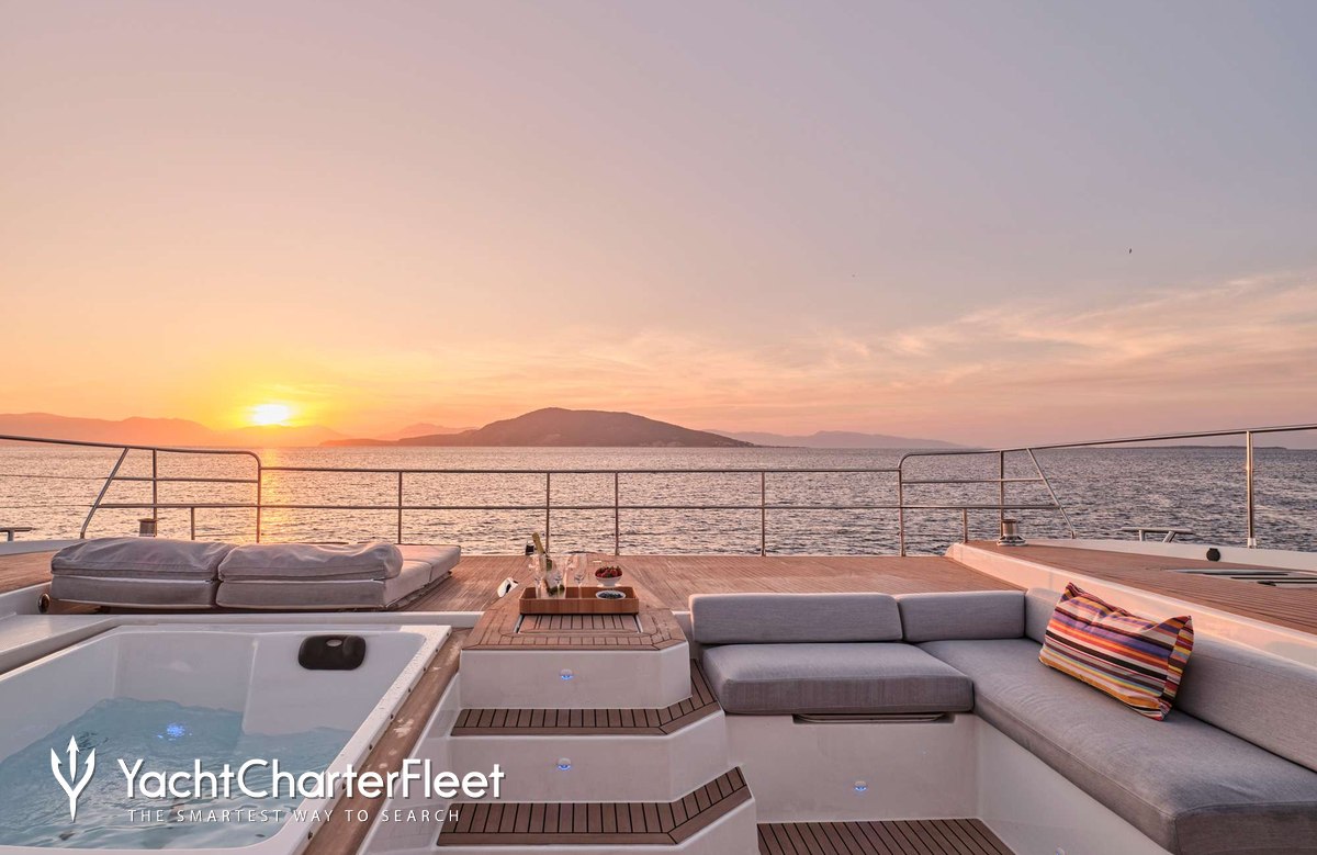 A charter on Alena is comfortable and convenient thanks to the provided amenities, particularly a deck jacuzzi, perfect to enjoy the scenery with your favourite drink in hand.