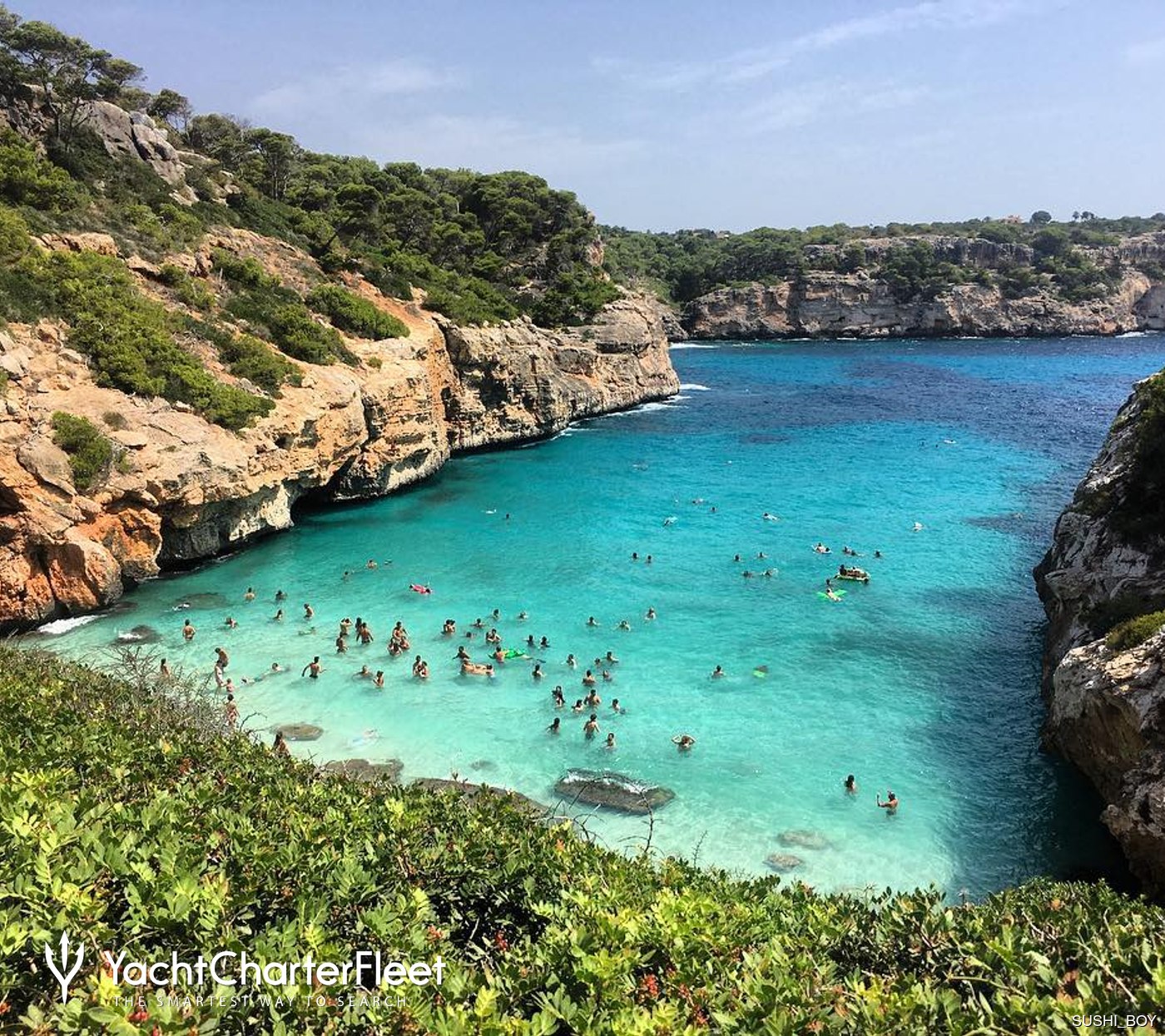 This picturesque cove is surrounded by rugged cliffs and lush vegetation, creating a contrast with the clear blue waters. The unique landscape makes it a choice location for photographers, nature lovers, and guests looking to escape the busiest resorts. For anyone enjoying a Balearic Islands yacht charter, the view of this cove from the water is particularly striking, as the white sand and bright water stand out against the rocky shoreline.