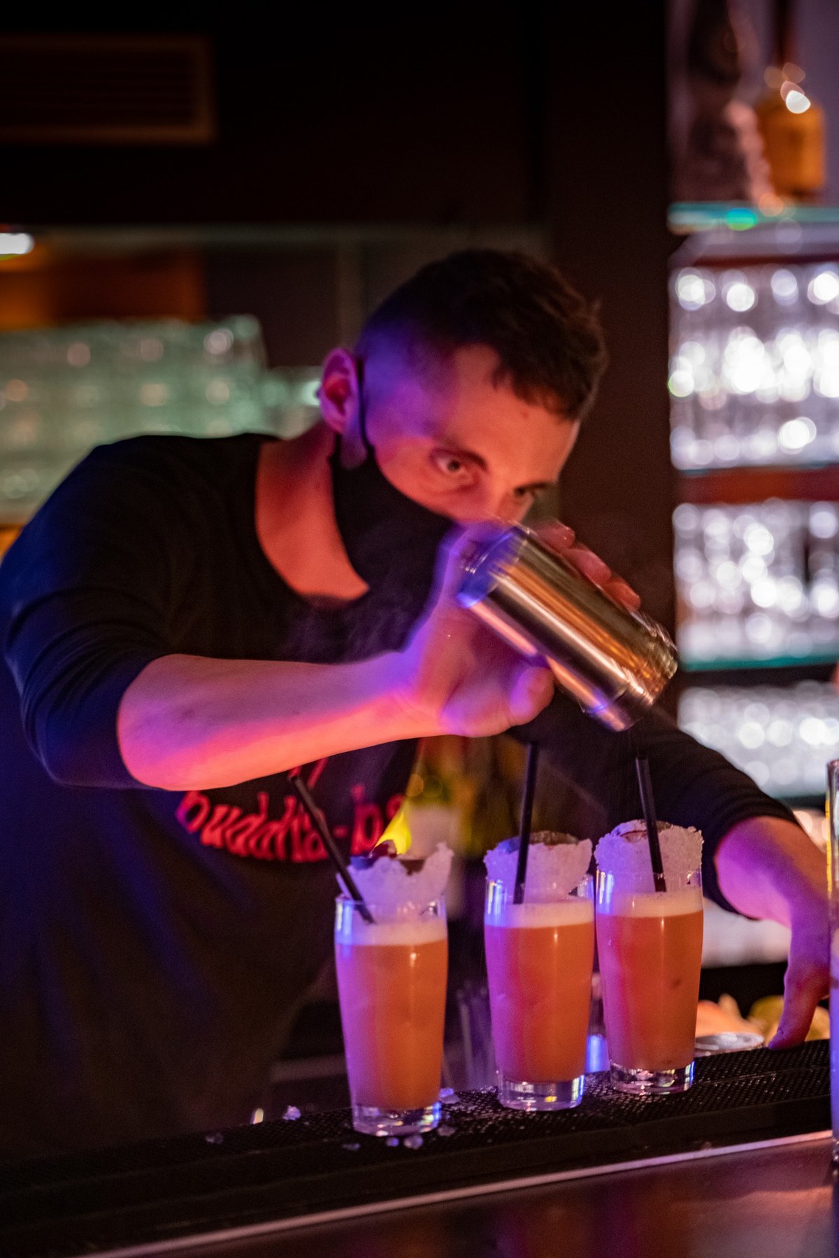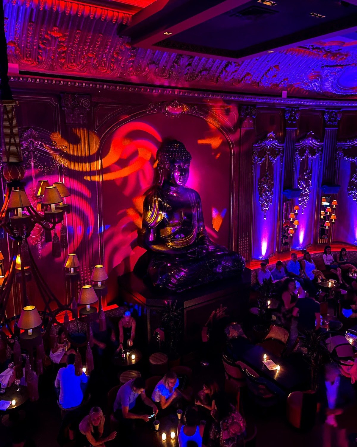 The addition of Asian motifs, dim lighting, and rich scarlet upholstery has given the space a lounge-style setting, while the colossal statue of a meditating buddha nods to the venue’s namesake.