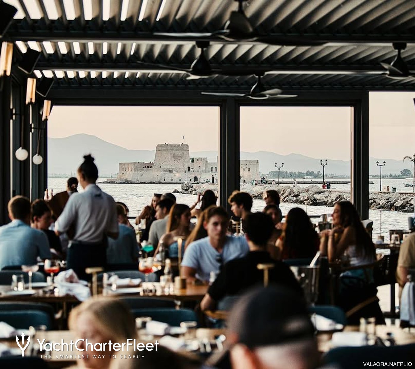 The setting offers wide sea views, with the famous Bourtzi Castle rising from the water just offshore. From the terrace, guests can also see the stone remains of the Five Brothers bastion above, a defensive point built to protect the city. As the sun lowers over the Gulf, the light hits the fortress and the sea in a way that draws people in for more than just the food.