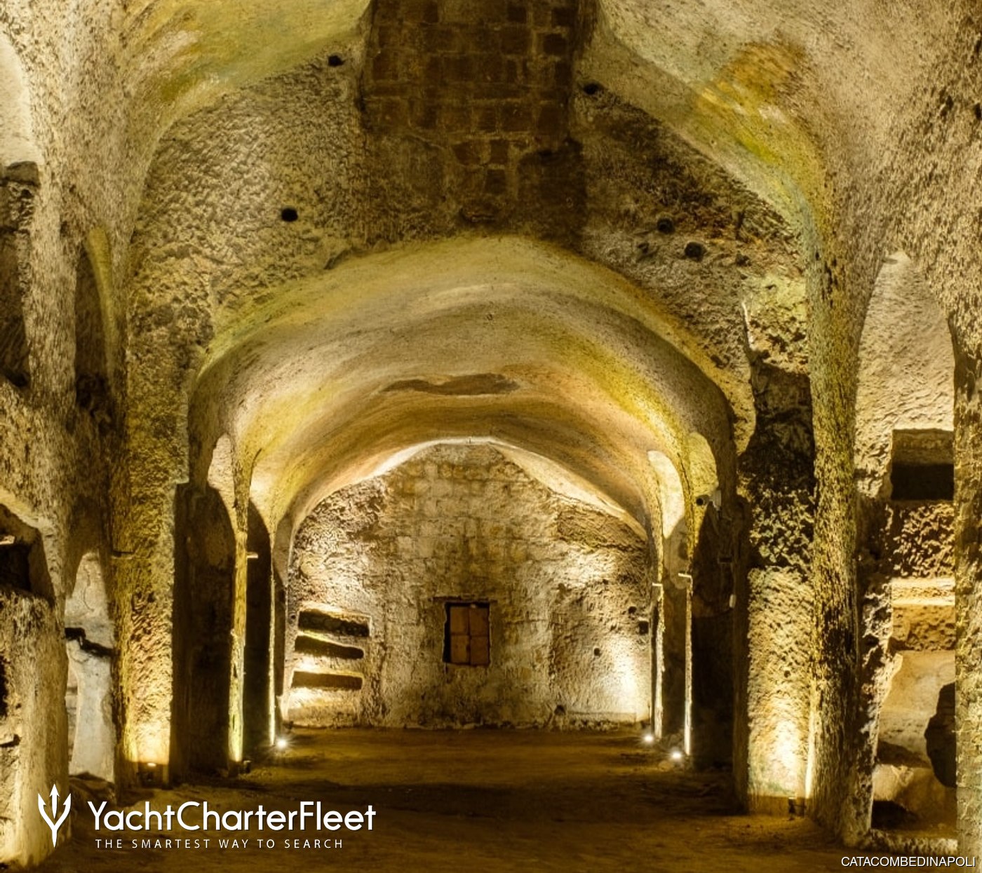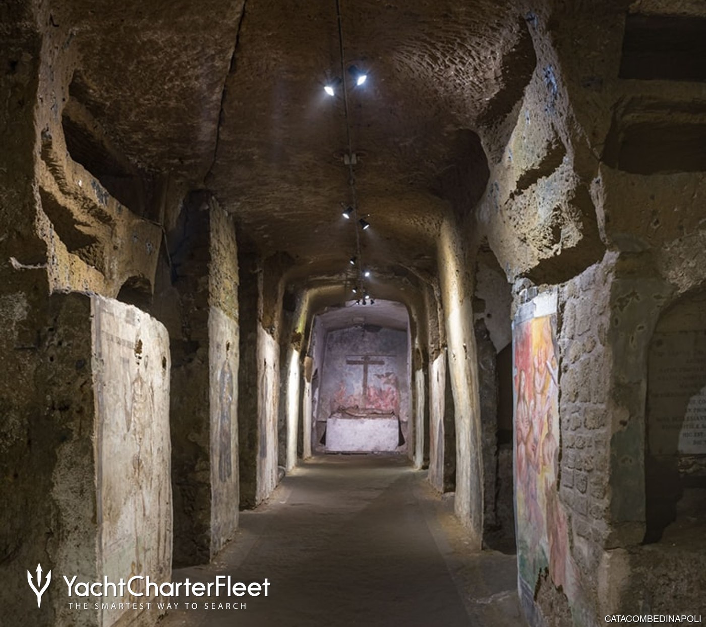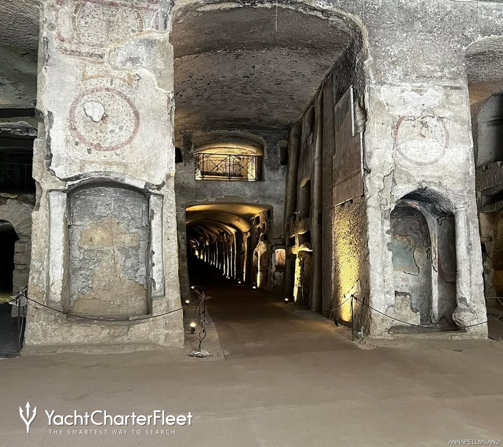 Visitors walk through long corridors carved into volcanic rock, moving through spaces that feel calm and almost suspended in time. The two main levels are unusually spacious for an underground burial site, which makes it easy to explore during a Naples yacht charter stop in the city.