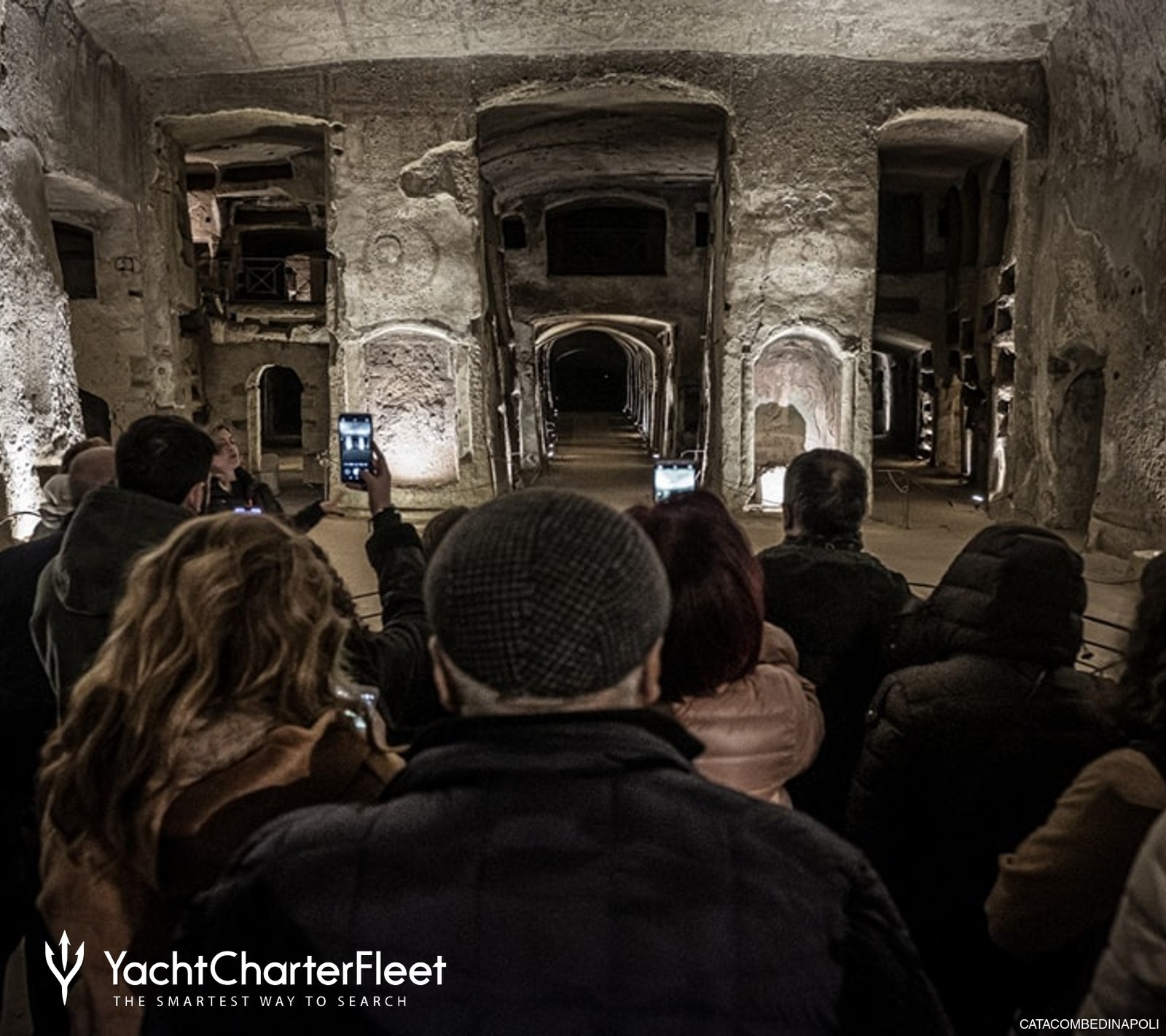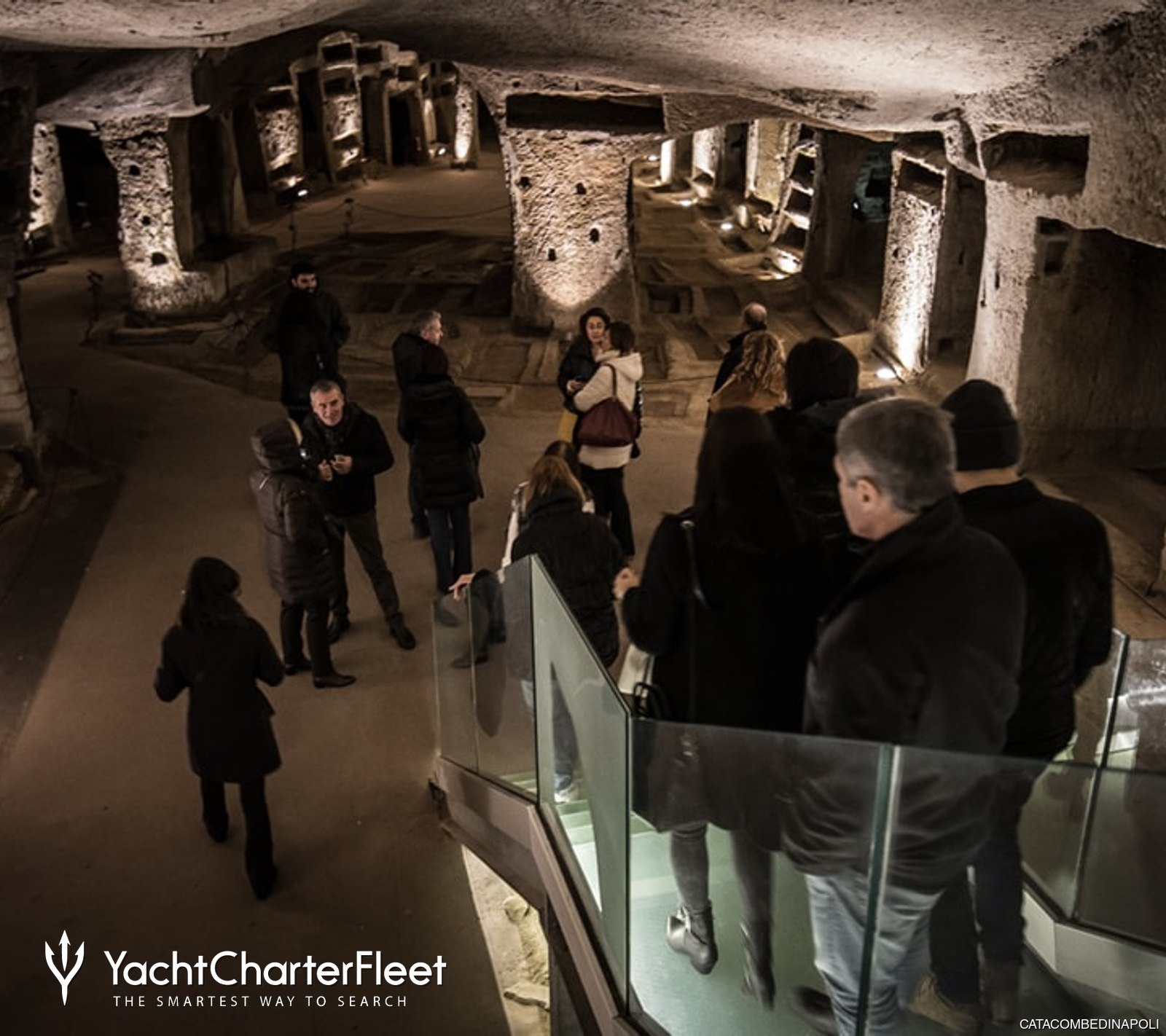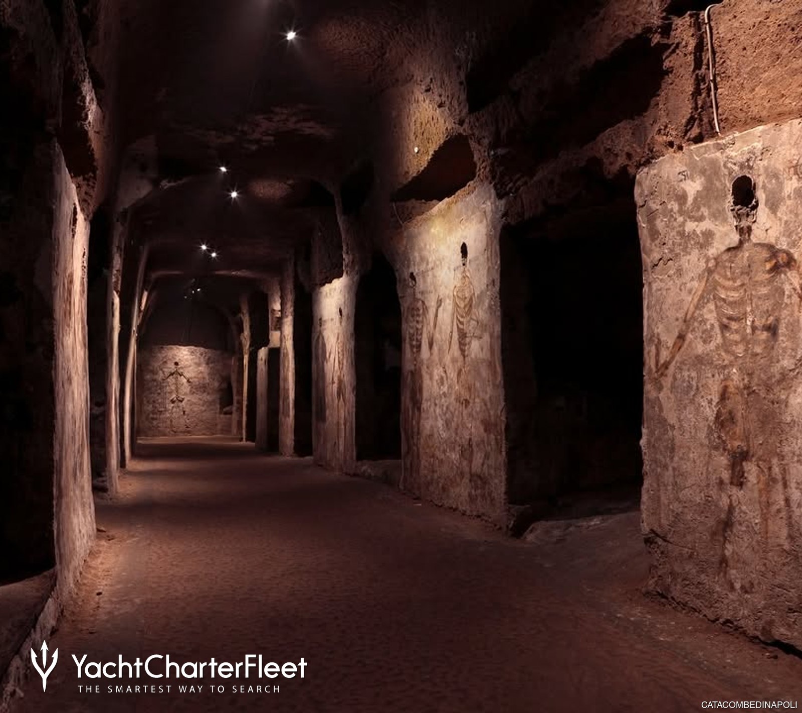 Visitors walk through long corridors carved into volcanic rock, moving through spaces that feel calm and almost suspended in time. The two main levels are unusually spacious for an underground burial site, which makes it easy to explore during a Naples yacht charter stop in the city.