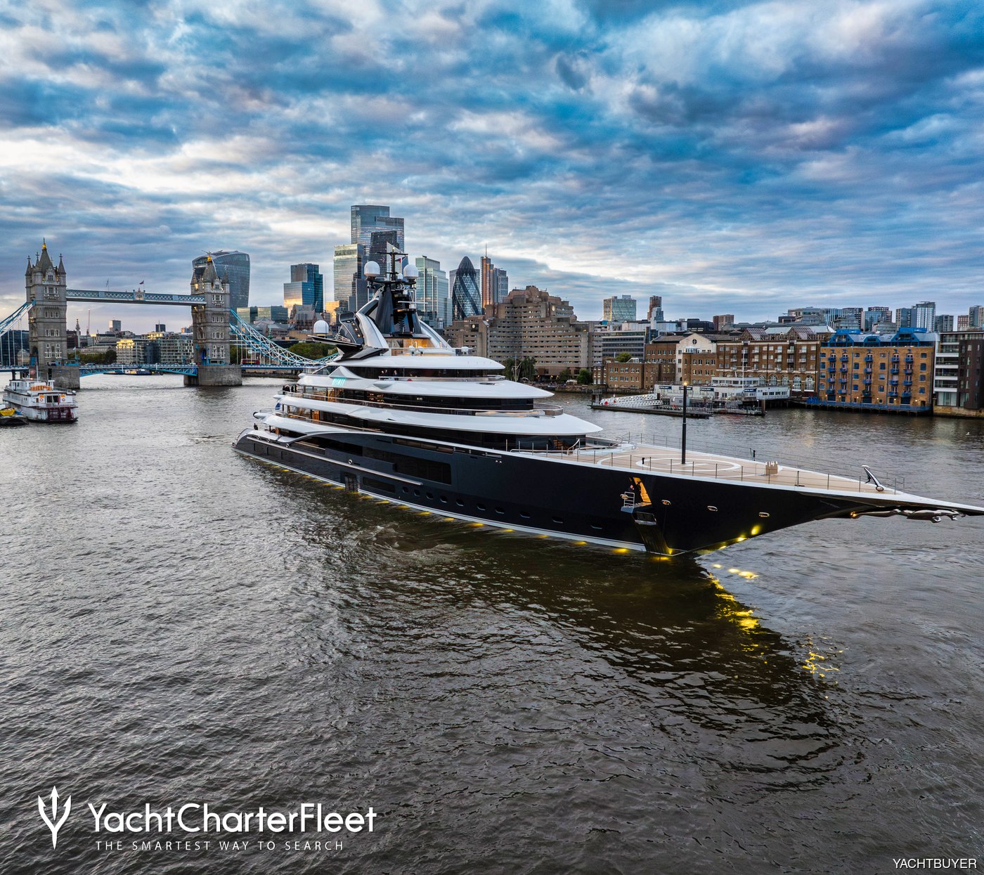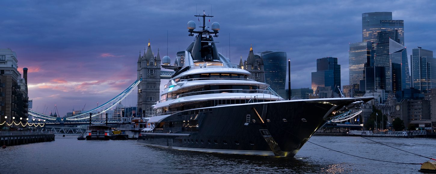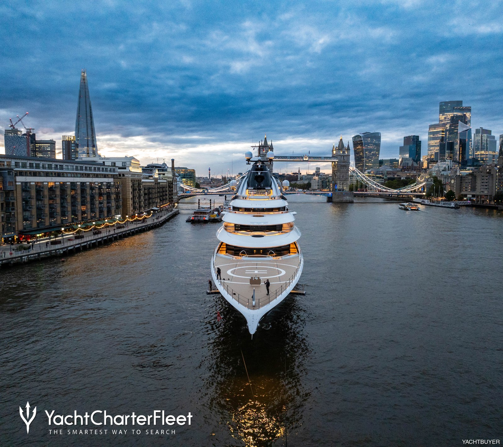 A year after making her global debut at the Monaco Yacht Show, 400ft (122m) superyacht charter KISMET has returned to the UK, adorning the River Thames by the famous UK landmark Tower Bridge.