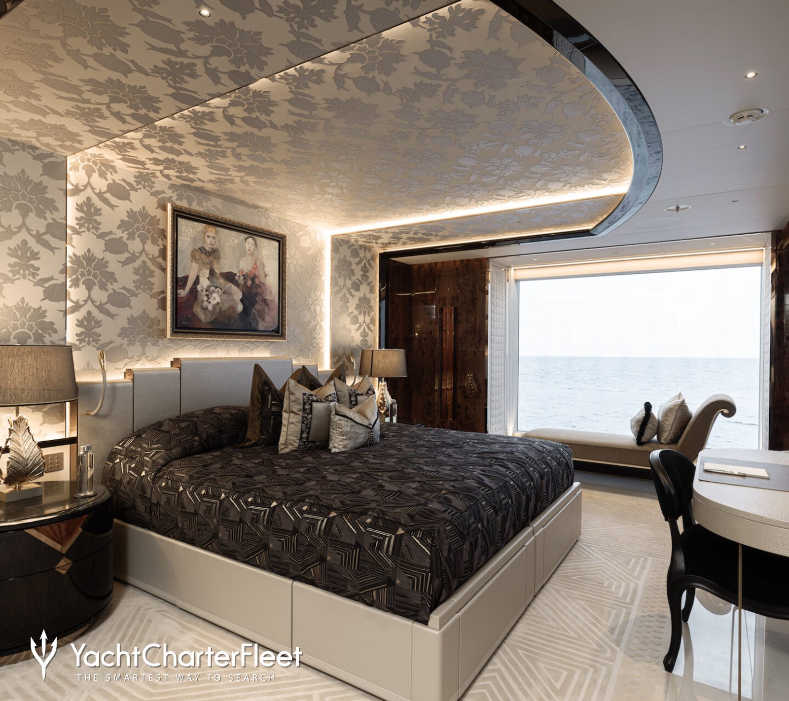 Previously known as Project Jag, there's seamless continuity throughout the decks onboard charter yacht KISMET, with open-plan layouts and an elevator. Interior aesthetics flow effortlessly from social areas to overnight accommodation, with a composition of eight cabins for up to 12 sleeping charter guests.