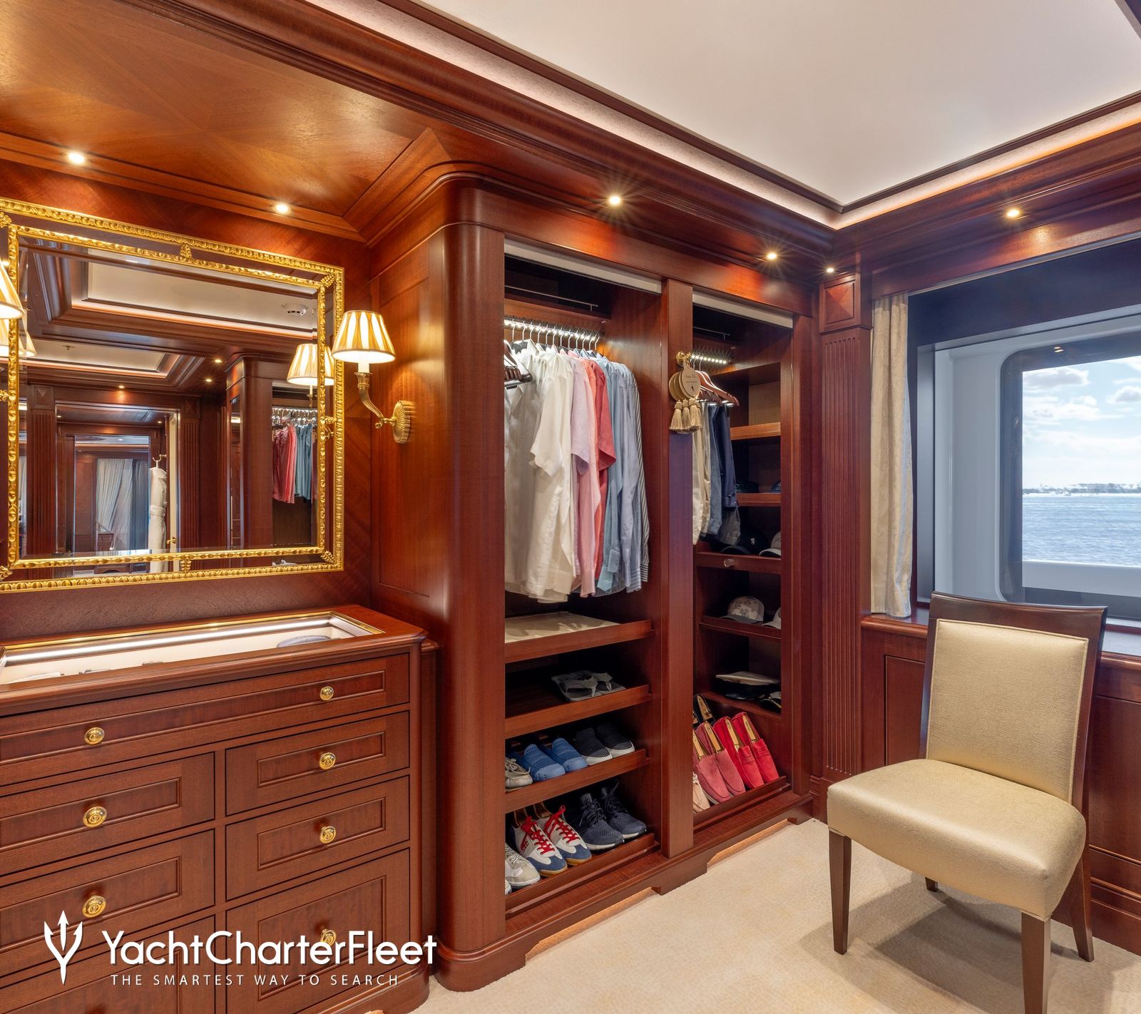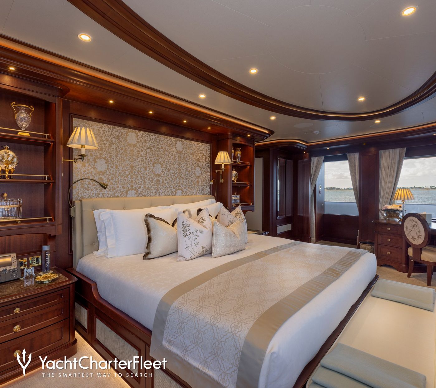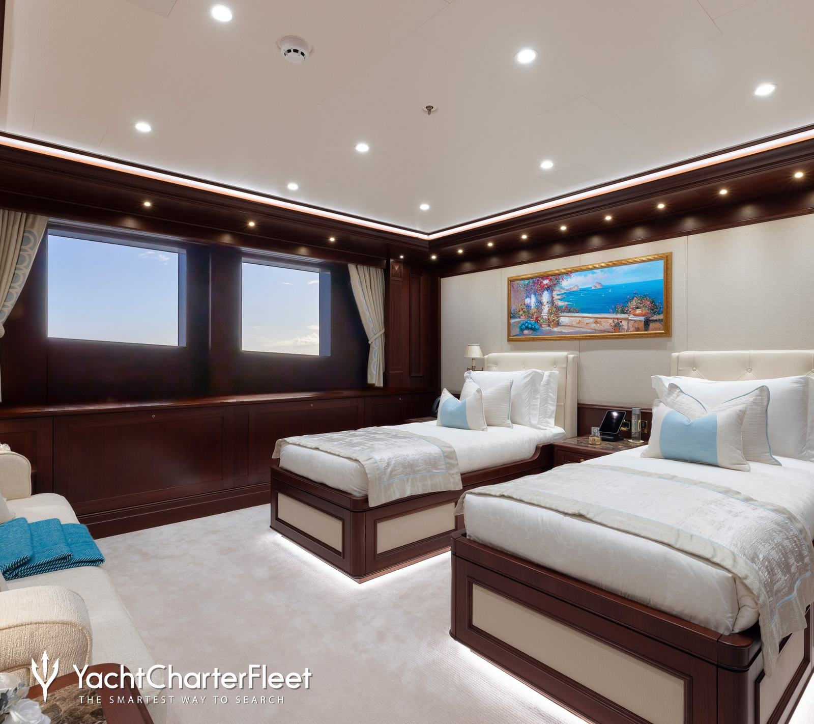 The full-beam master features a private study, dressing room, and a spacious ensuite bathroom. Additional accommodations include two VIP cabins and six convertible cabins that can be configured as twins or doubles depending on the charter group’s needs.