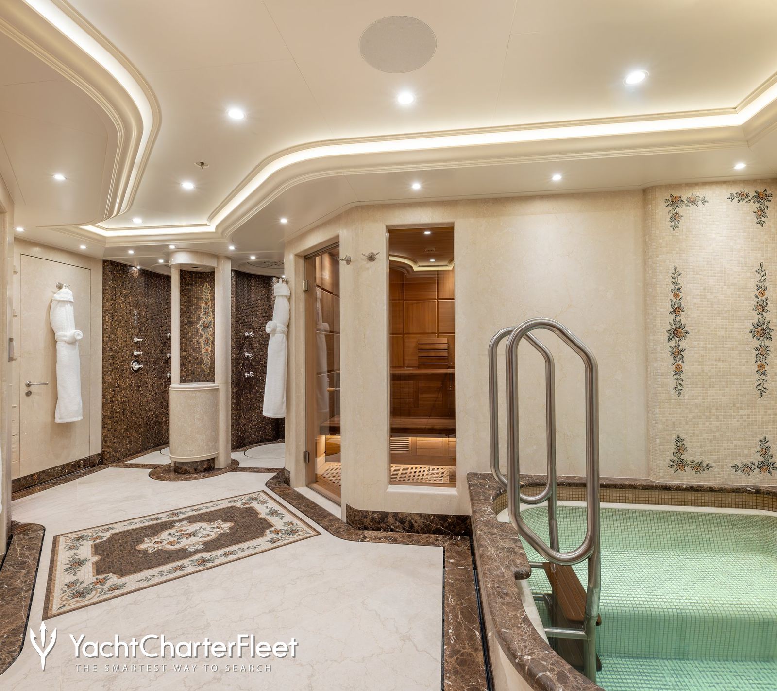 Beyond the main salon and guest lounges, the yacht rental also incorporates wellness-focused amenities, including a dedicated spa area designed to enhance the onboard charter experience.