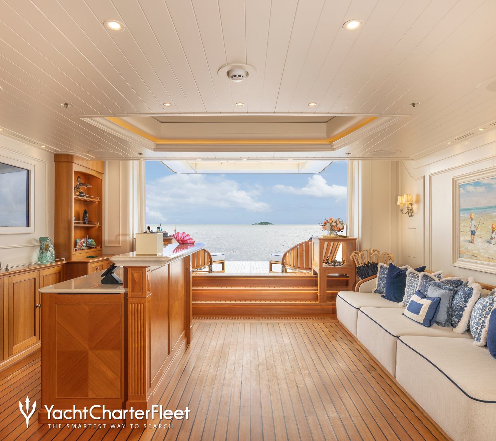 Large windows throughout the yacht allow natural light to flow into the main social areas, creating bright, welcoming spaces that encourage guests to relax between activities ashore and on the water.