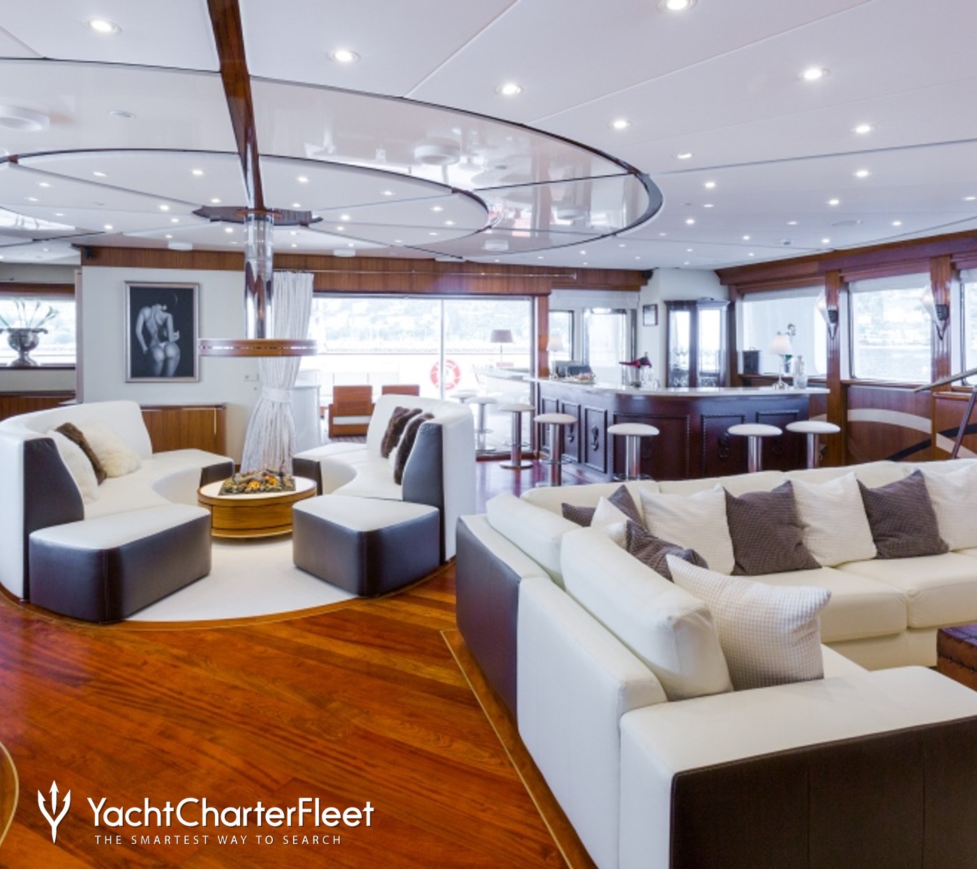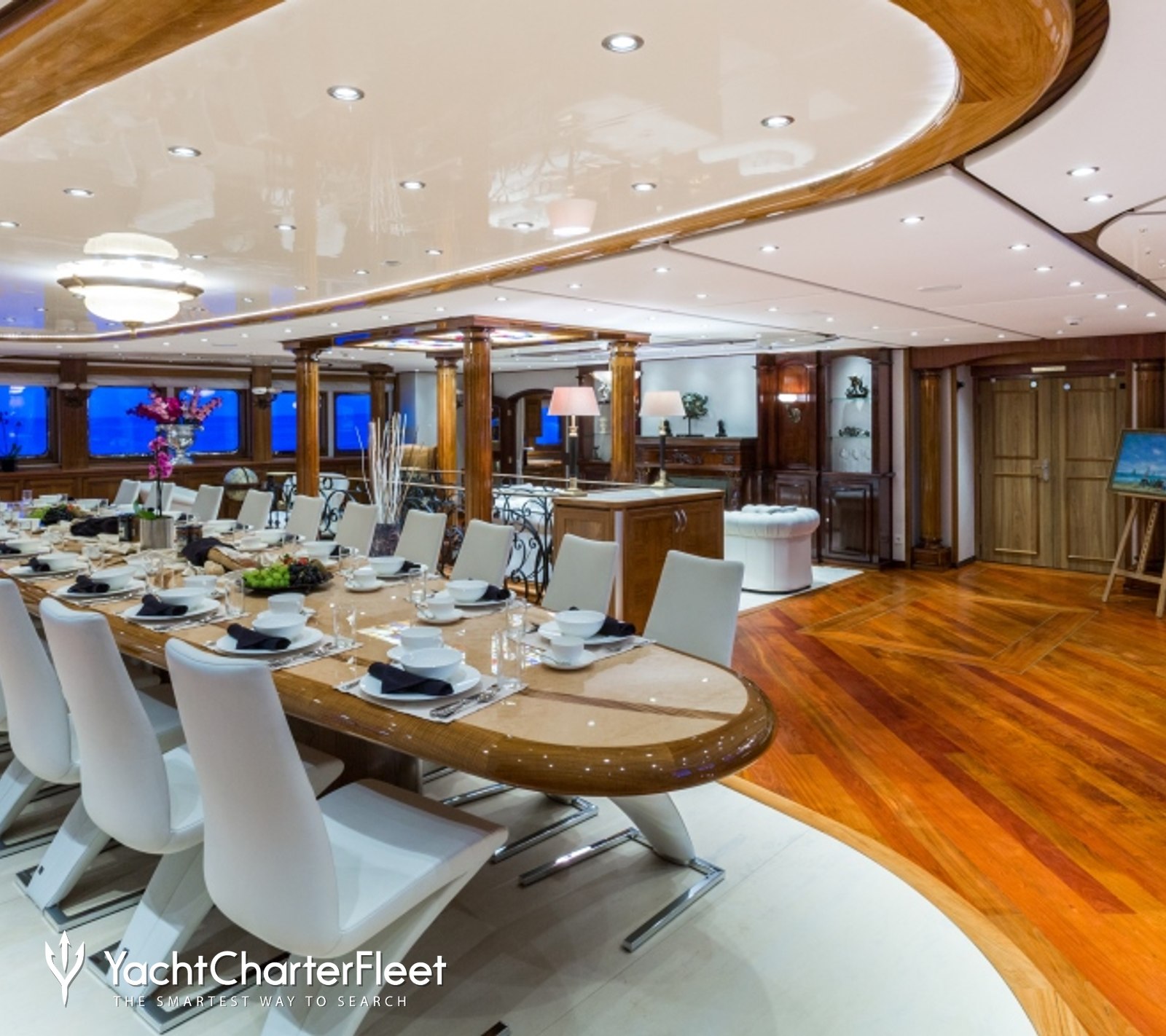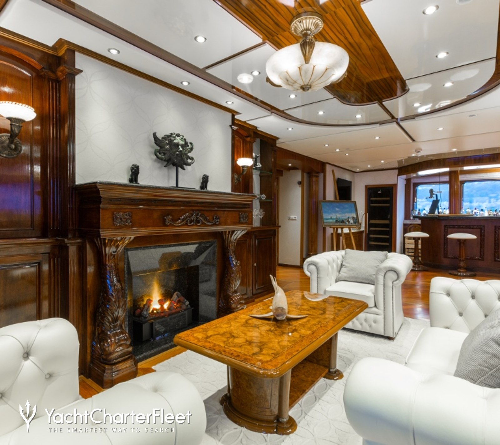 The charter yacht also features a plush 14-seat cinema, a whisky bar, and a cigar lounge, creating luxurious retreats for evenings onboard.